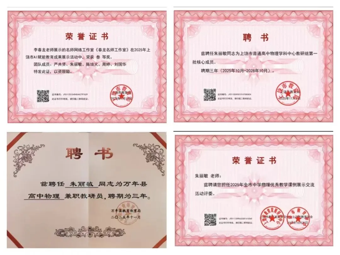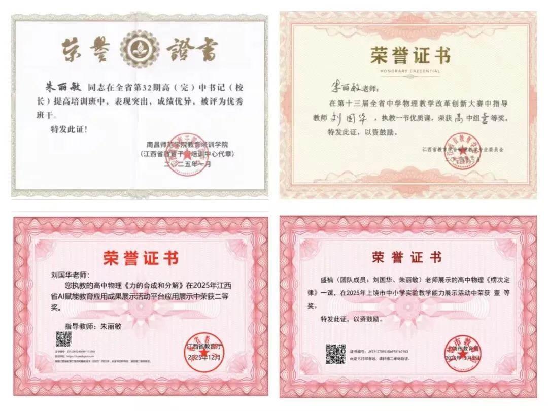 同时,我积极参与各类教学竞赛与展示活动,以赛促学、以赛促研。在第十三届全省中学物理教学改革创新大赛中,我指导青年教师执教优质课,荣获高中组一等奖,通过以老带新的方式助力青年教师快速成长;在2025年江西省AI赋能教育应用成果展示活动中,我指导刘国华老师执教的《力的合成和分解》一课荣获二等奖,充分展现了工作室在AI赋能物理教学方面的实践成果。此外,在2025年上饶市中小学实验教学能力展示活动中,我作为核心成员参与的高中物理《楞次定律》一课,凭借创新的实验设计和高效的课堂呈现荣获壹等奖,进一步锤炼了自身的实验教学能力。