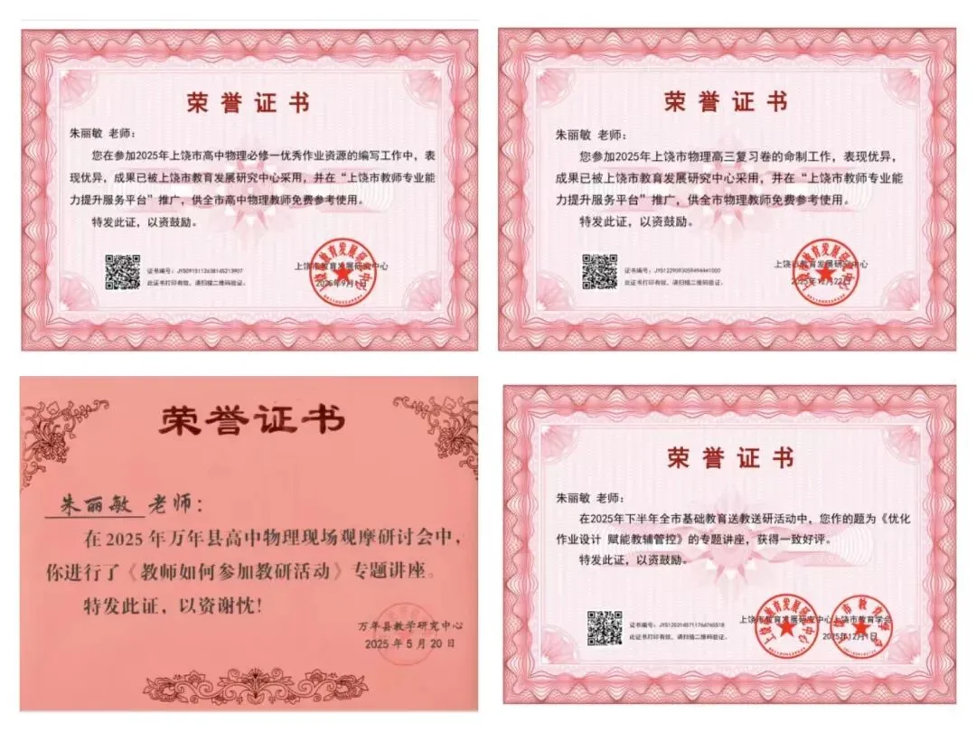 在资源建设方面,我承担了多项市级教学资源的编写与命制工作。参与2025年上饶市高中物理必修一优秀作业资源编写,所编成果被上饶市教育发展研究中心采用,并在“上饶市教师专业能力提升服务平台”推广,供全市高中物理教师免费参考使用;受邀参与2025年上饶市物理高三复习卷的命制工作,严格依据课程标准和高考要求,精心设计试题,成果同样在市级平台推广,为全市高三物理复习教学提供了优质资源支撑。