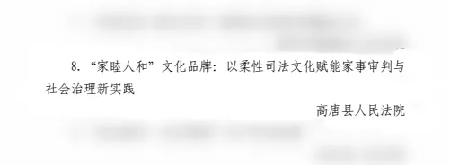 高唐法院《“家睦人和”文化品牌:以柔性司法文化赋能家事审判与社会治理新实践》在全省法院文化建设深度融入审判工作特色项目推介活动中荣获三等奖。