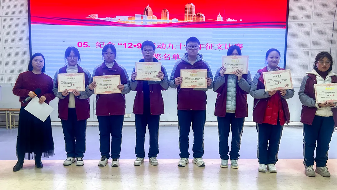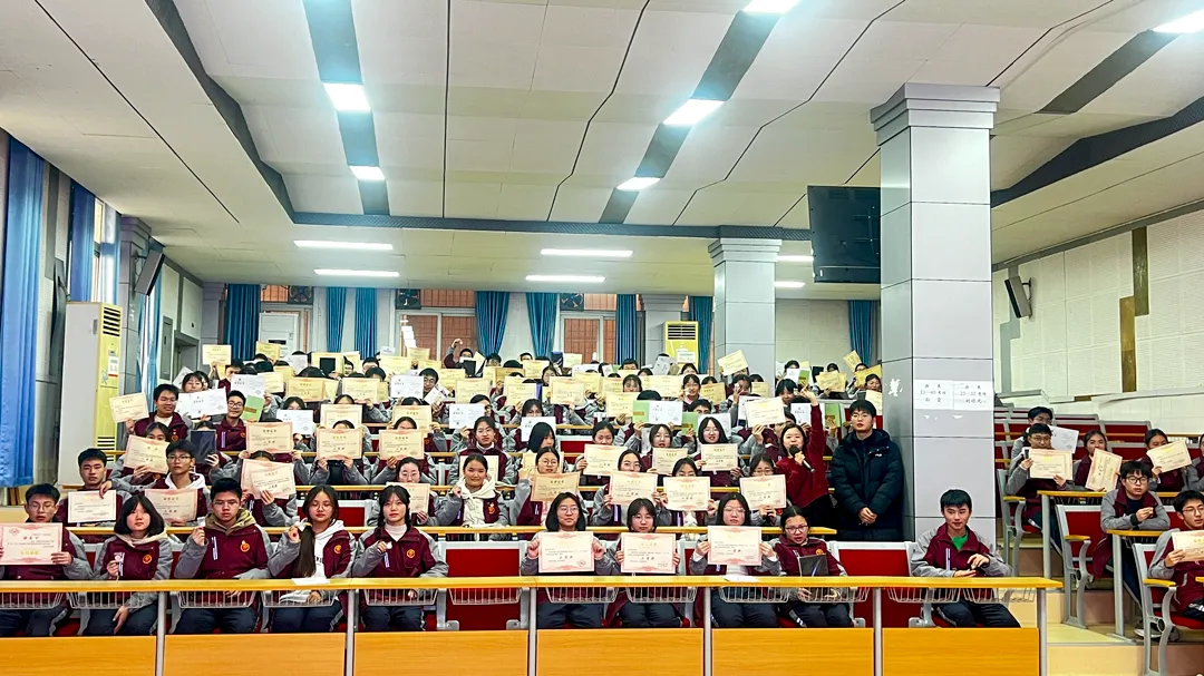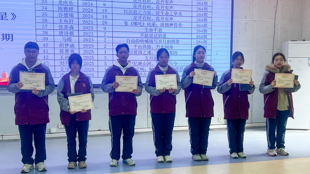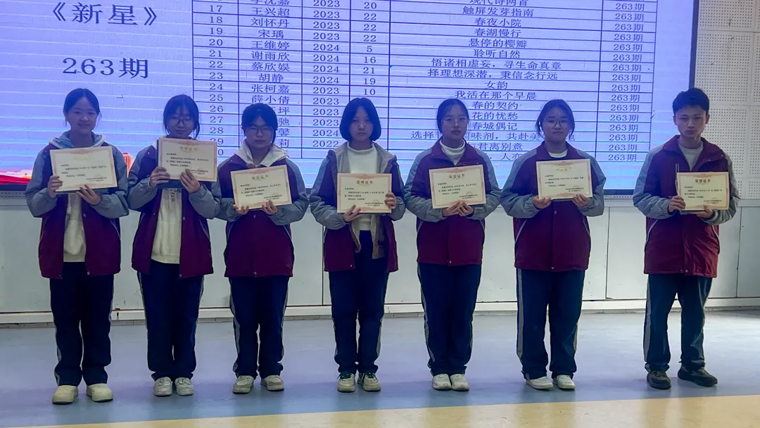 表彰环节是本次大会的重头戏。现场依次宣布了多项赛事及投稿的获奖名单:2025 年春季《新星》报发表文章的社员、第二十五届世界华人学生作文大赛获奖者、第 22 届叶圣陶杯全国中学生新作文大赛及全国总决赛获奖者、“立报国强国大志向・做挺膺担当奋斗者” 主题征文获奖者、纪念 “12・9” 运动九十周年征文比赛获奖者以及 2026 年 1 月作品上榜的社员。与会领导为获奖同学逐一颁发奖证及奖品,台下掌声雷动,既是对获奖者的祝贺,也是对文学社育人成果的肯定。