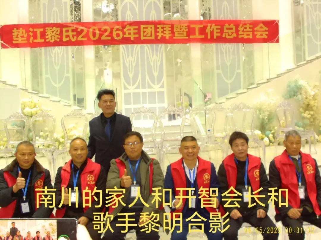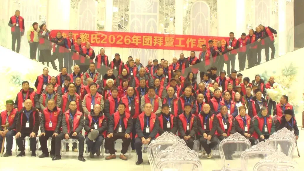 岁寒情暖,宗谊绵长。2026年1月17日,重庆垫江黎氏八郎公理事会成功举办2026年团拜会,为重庆黎氏家族亲情联络与文化交流再添浓墨重彩的一笔。本次团拜会由重庆垫江黎氏八郎公理事会会长黎开智主持,南川黎氏茂祥祖后裔、垫江黎氏八郎公后裔、丰都黎氏宗亲、贵州黎氏宗亲等近百位宗亲齐聚一堂,共襄盛举;特别令人欣喜的是,垫江籍歌手黎明登台助兴,用歌声为团拜会增添了一抹亮色,现场气氛热烈,亲情洋溢。