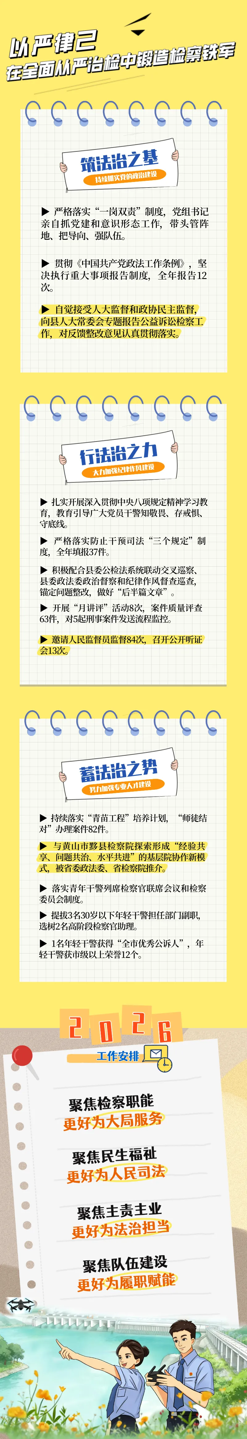 大道如砥,行者无疆;奋楫争先,笃行不怠。法治进程的宏大叙事,离不开基层检察机关的坚实支撑,服务旌德高质量发展、保障人民安居乐业,使命光荣、责任千钧。2026年,我们将在县委及上级院的坚强领导下,全面落实本次大会精神,自觉接受社会各界监督,依法履行法律监督职能,为建设长三角美丽中国先行示范区,打造高质量绿色发展新旌德贡献力量、交好答卷!