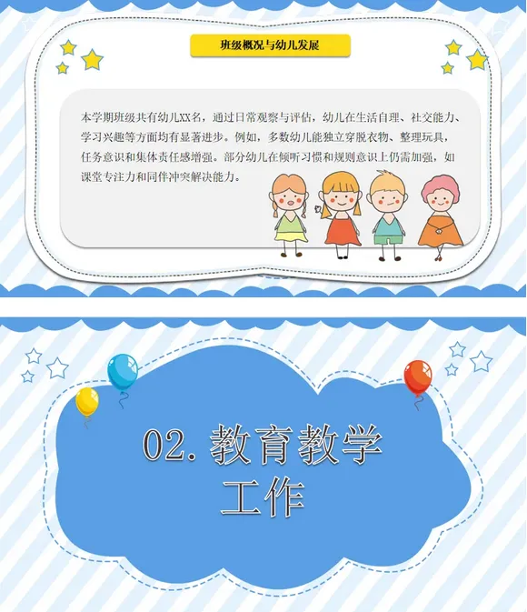 时光匆匆,幼儿园第一学期的工作已圆满落幕。本学期,在幼儿园领导的科学指导下,班级两位老师默契配合、携手共进,始终以《3-6岁儿童学习与发展指南》为纲领,立足本班幼儿年龄特点与发展需求,扎实推进班级管理、教育教学、家园共育、卫生保健等各项工作,用心呵护每一位幼儿的成长,让幼儿在温馨和谐的集体中收获快乐、积累经验、提升能力。现将本学期班务工作详细总结如下: