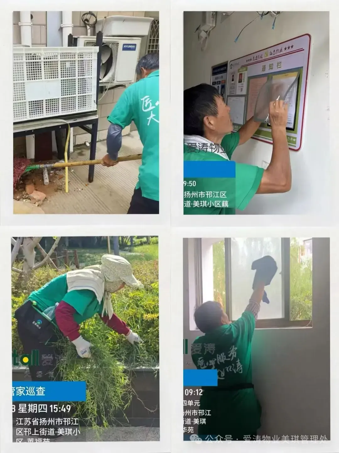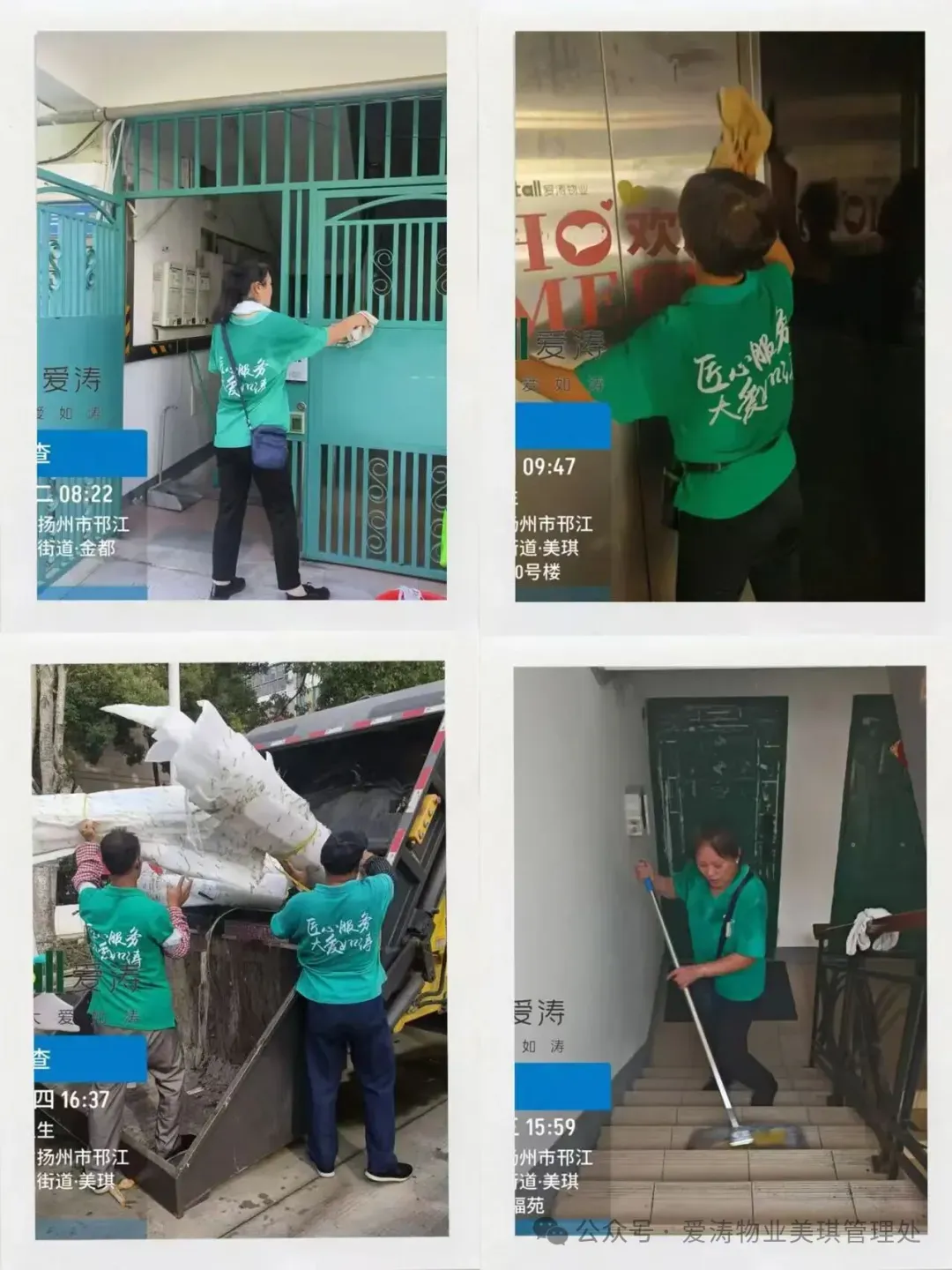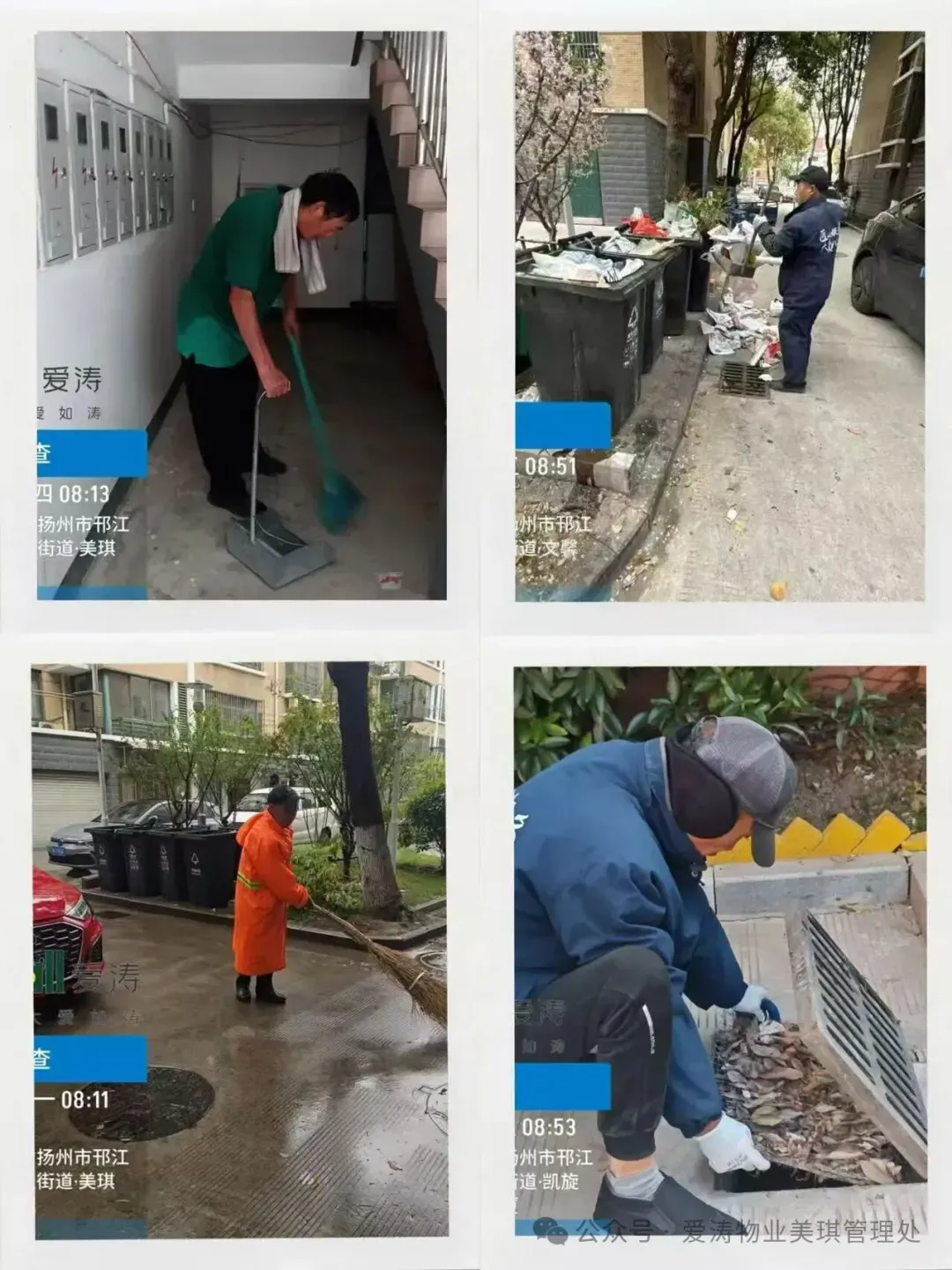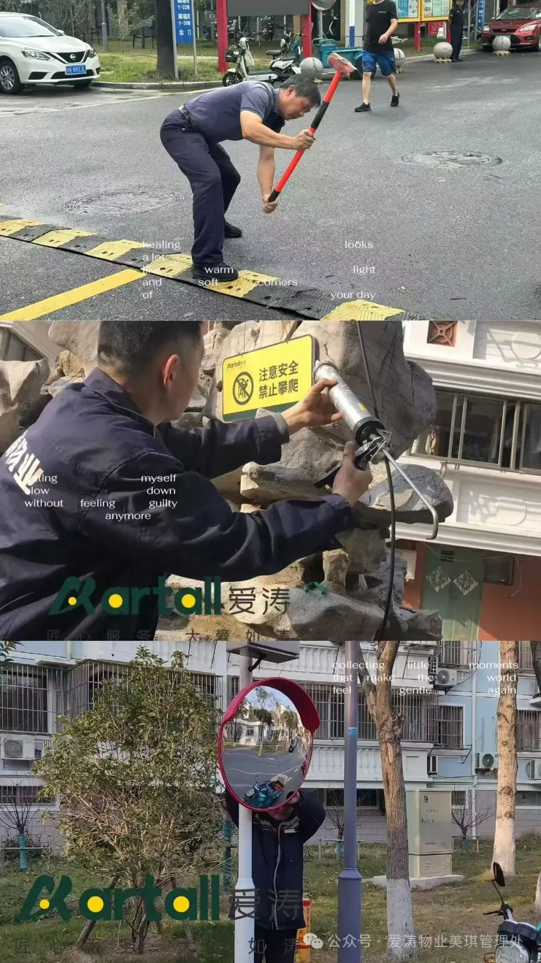 保洁人员“以帚为笔,以净为画”的勤勉,当晨曦微露,他们就已开启一天的忙碌,擦拭每一处栏杆、清扫每一条甬道,用洁净的环境装点业主的日常;
