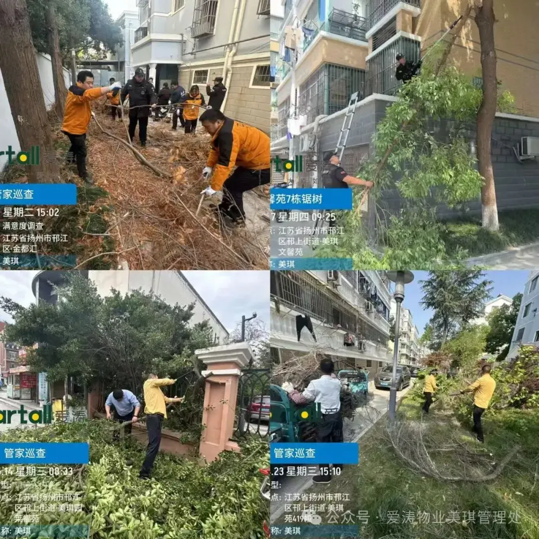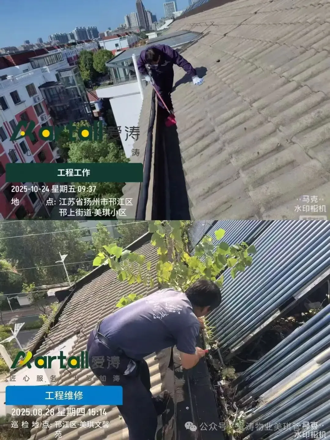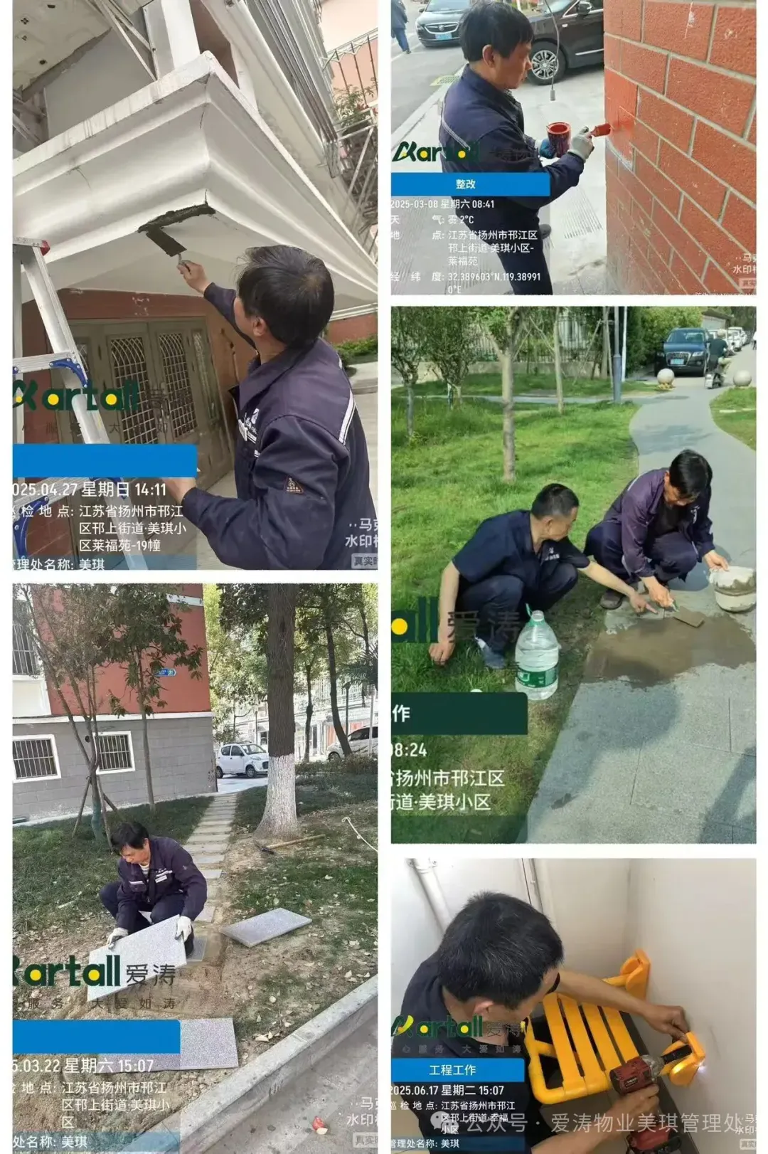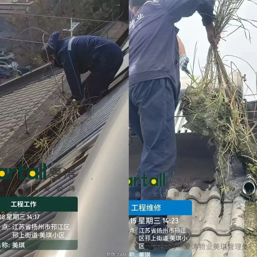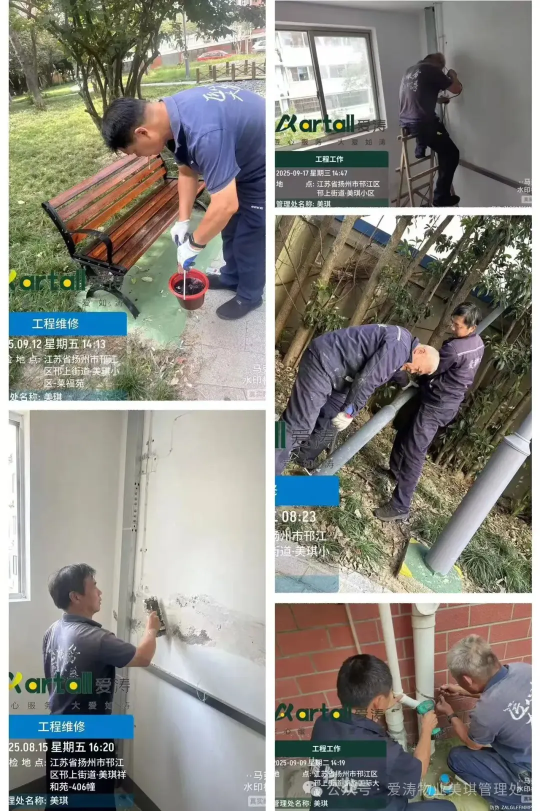 园区内的扫地车穿梭在各个主干道与休闲区域,所过之处,落叶、纸屑、尘土被尽数清扫,高效完成路面清洁工作,为业主们打造出干净整洁的出行环境。园区死树清理、莱福苑东侧围墙杂树清理、祥和苑北围墙水杉进行修剪清理树枝等工作集体劳动是爱涛团队专项作业模式,每月定期组织集体劳动:如暴雨后淤泥清理、大风后落叶堆积、节日活动后场地清理或开展深度保洁工作(如园区大扫除、绿化带种菜清除),提升保洁工作的整体效率与质量。二、工程服务