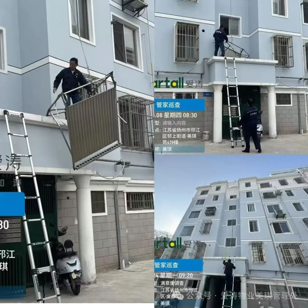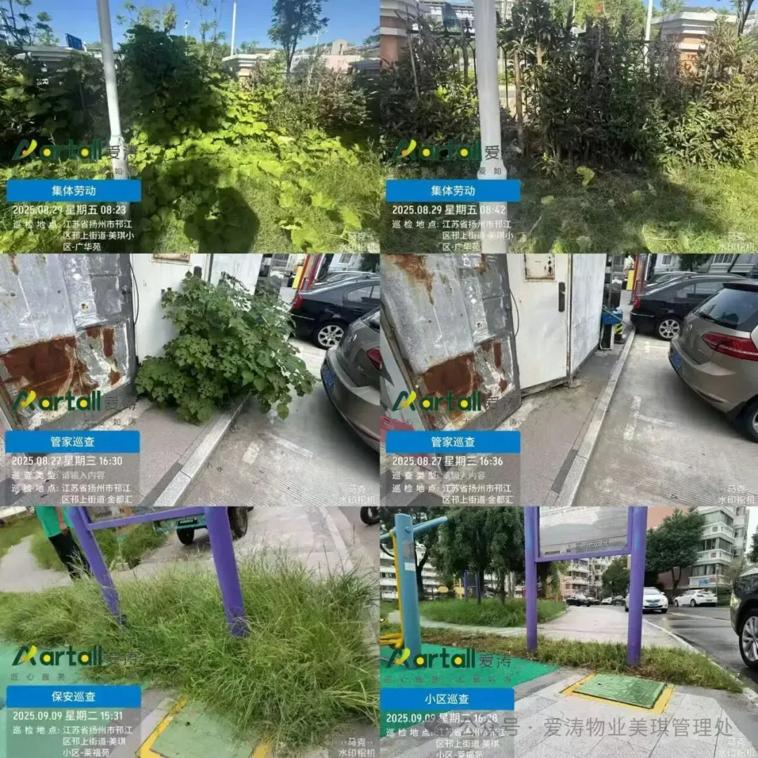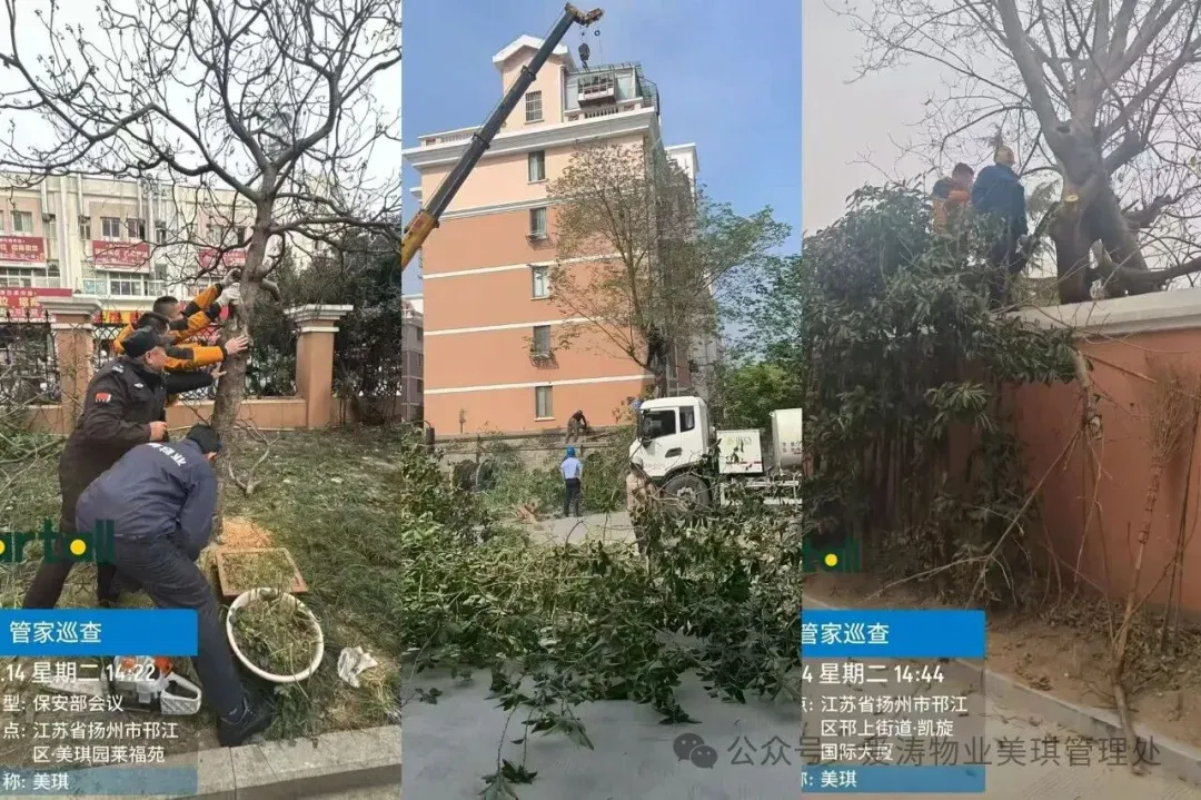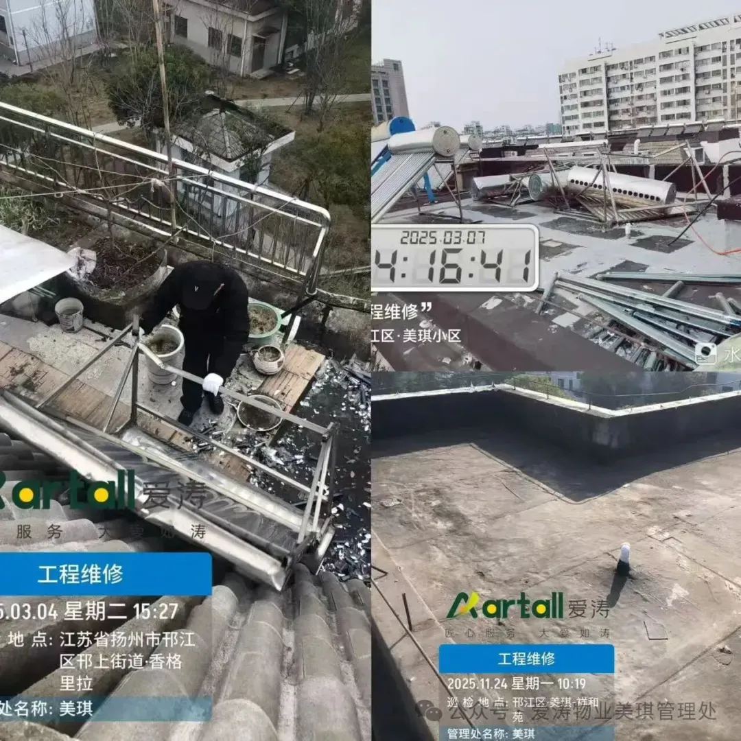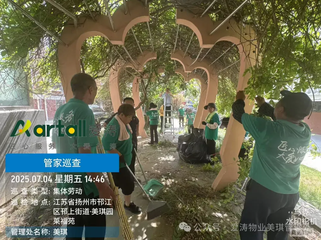 园区内的扫地车穿梭在各个主干道与休闲区域,所过之处,落叶、纸屑、尘土被尽数清扫,高效完成路面清洁工作,为业主们打造出干净整洁的出行环境。园区死树清理、莱福苑东侧围墙杂树清理、祥和苑北围墙水杉进行修剪清理树枝等工作集体劳动是爱涛团队专项作业模式,每月定期组织集体劳动:如暴雨后淤泥清理、大风后落叶堆积、节日活动后场地清理或开展深度保洁工作(如园区大扫除、绿化带种菜清除),提升保洁工作的整体效率与质量。二、工程服务