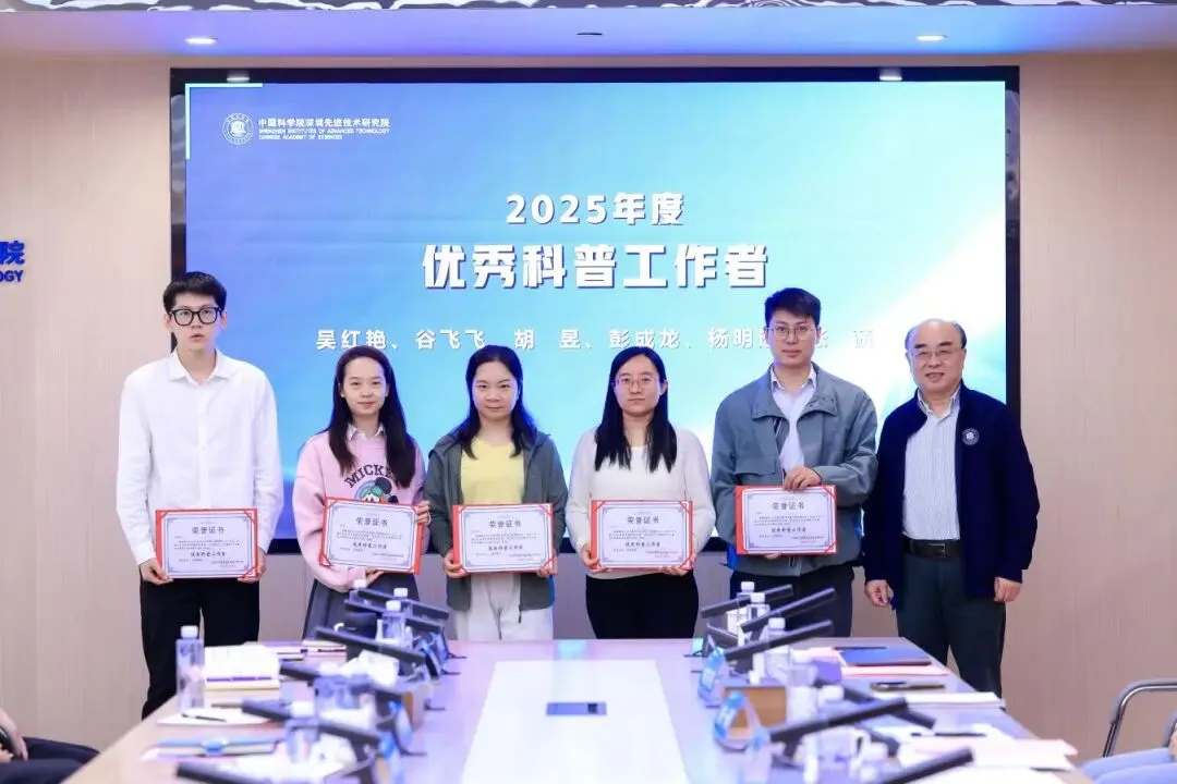 深圳先进院副院长、科普工作委员会主任梁栋颁发“科学传播贡献奖”(由左至右):郝梦娣、朱理圳、谭骁天、宋逸凡、孙立群。