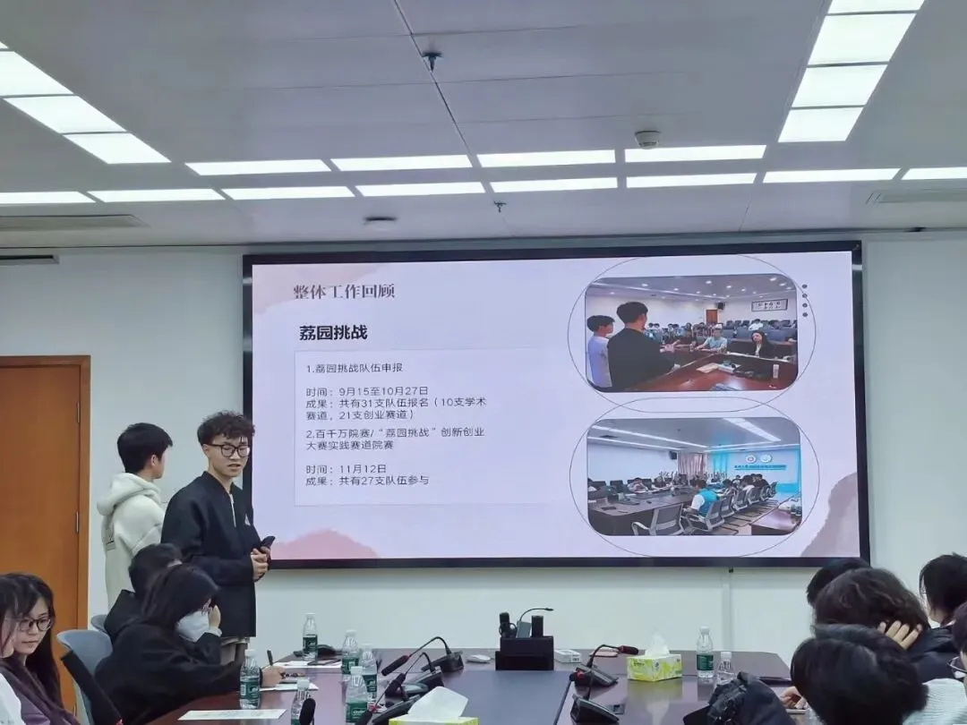 实践部唐启哲与曾浦洲同学共同汇报,详细介绍了“百千万工程”“荔园挑战杯”的组织申报与“攀峰计划”的推进情况,并反思了干事参与度、任务分配机制、成果审核等方面存在的问题,提出建立明确分工与审核机制等改进措施。