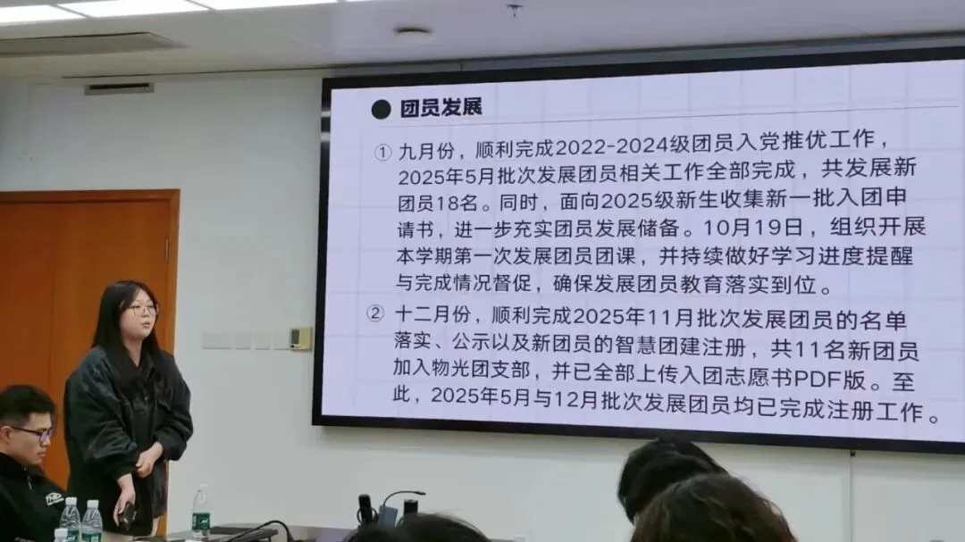 组织部部长张雯淇汇报了统计新生团员信息,团员评议、入党推优、团务管理等基础团务工作的完成情况,并表示将继续推进团课开展,并计划下学期组织企业参访、升旗仪式等实践活动。