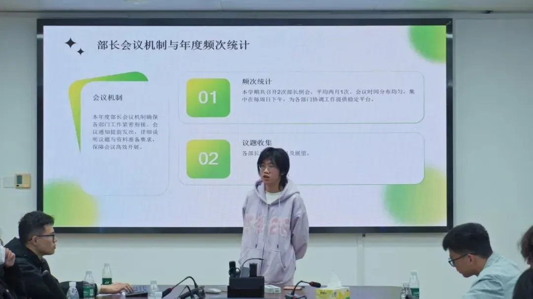 随后,团学各部门负责人依次汇报了本学期工作成果与未来计划。