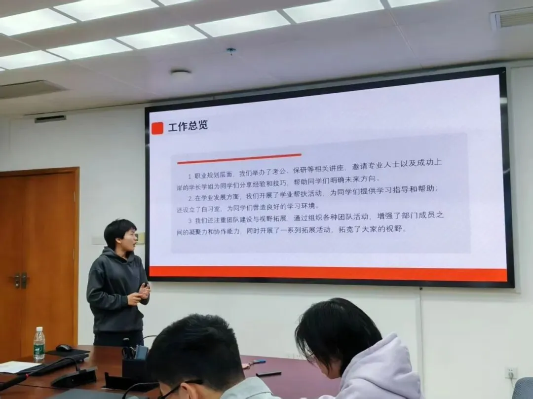 生涯部部长吴熔耀重点介绍了本学期举办的保研分享会、学业帮扶活动和自习室打卡等工作成果。其中保研分享会反响热烈,线下座无虚席,但学业帮扶活动呈现“高开低走”态势,因讲师寻找困难、活动形式等问题导致后期参与度下降。部门将优化活动形式、加强宣传与分工,并计划拓展如考研等更多分享主题。