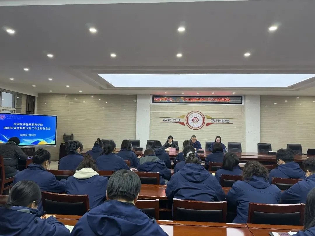 2026年1月19日,河南医药健康技师学院2025年度宣传思想文化工作总结复盘会在行政楼三楼会议室召开。校党委副书记刘如江、纪委书记夏彩玲出席会议,开封日报社记者尹杰受邀作新闻宣传专题培训,各部门新闻宣传员参加会议,会议由宣传部(统战部)部长朱滢莹主持。