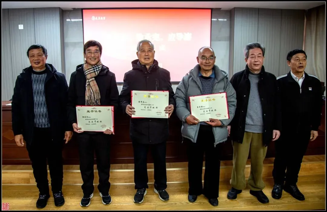 会上,为市退教协会作出突出贡献张有志会长、徐承宪老师、应导濂老师举行了荣休仪式,朱少刚副会长分别为三位老同志宣读荣休致辞后,方松根会长为他们颁发了“突出贡献奖”荣誉证书。之后,方会长代表市退教协会聘请赵石荣、张伟刚担任理事会成员。全体理事会成员在会场合影留念。