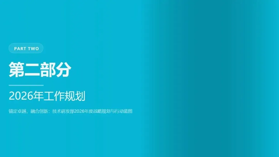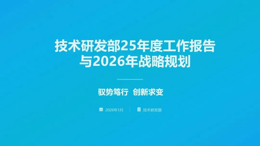 2025年这一年,我们靠实干拼出成绩,在挑战中锤炼团队,也看清自身的短板。2026年,蓝图已经绘好,关键就在落地执行。技术研发部全体同仁会始终保持对市场的敬畏、对攻坚的勇气、对卓越的追求,把每一项规划都变成具体行动,把每一个目标都变成实际成果。我们坚信,在公司领导的战略指引和各兄弟部门的全力支持下,只要我们凝心聚力、创新实干,一定能把技术研发部打造成公司发展的核心引擎,为公司在激烈的市场竞争中抢占先机、铸就辉煌,贡献不可替代的科技力量!驭技术之舟,创未来之业。2026年,我们携手并肩,全力以赴!