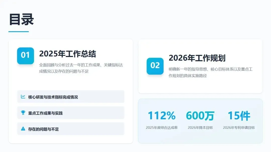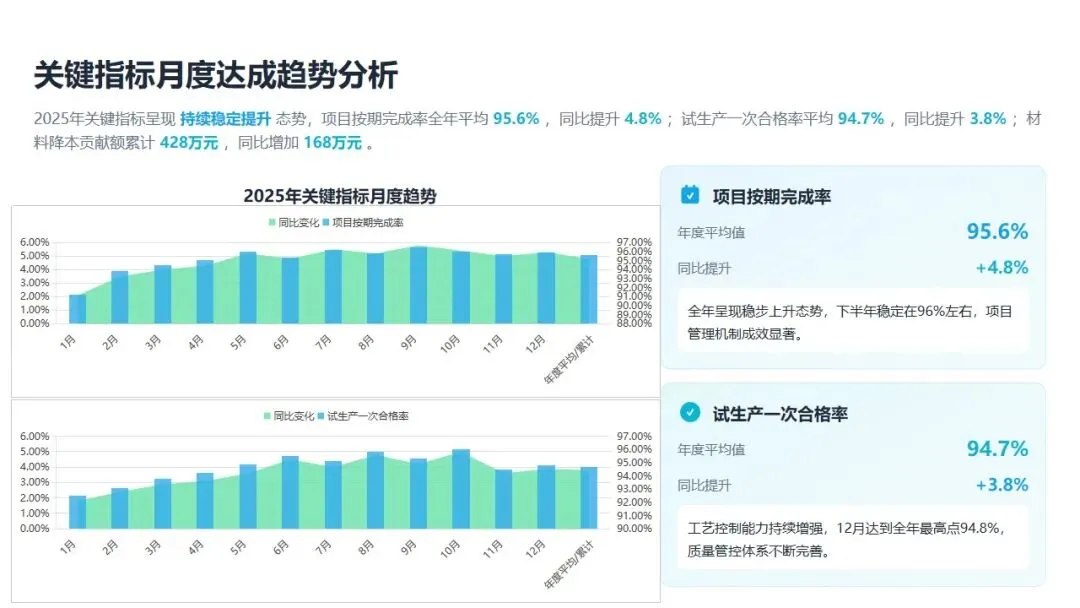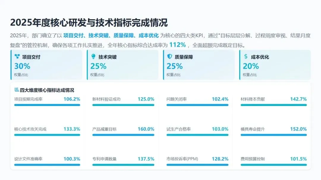 2025年我们锚定项目交付、技术突破、质量保障、成本优化四大核心KPI,靠目标层层拆、每周盯进度、每月做复盘的闭环管控,把各项工作落到了实处。全年核心指标综合达成率112%,所有目标全部超额完成,交出了一份亮眼答卷。表1:2025年度核心研发与技术指标完成情况一览表指标维度 | 核心指标 | 年度目标 | 实际完成值 | 达成率 | 数据来源 |