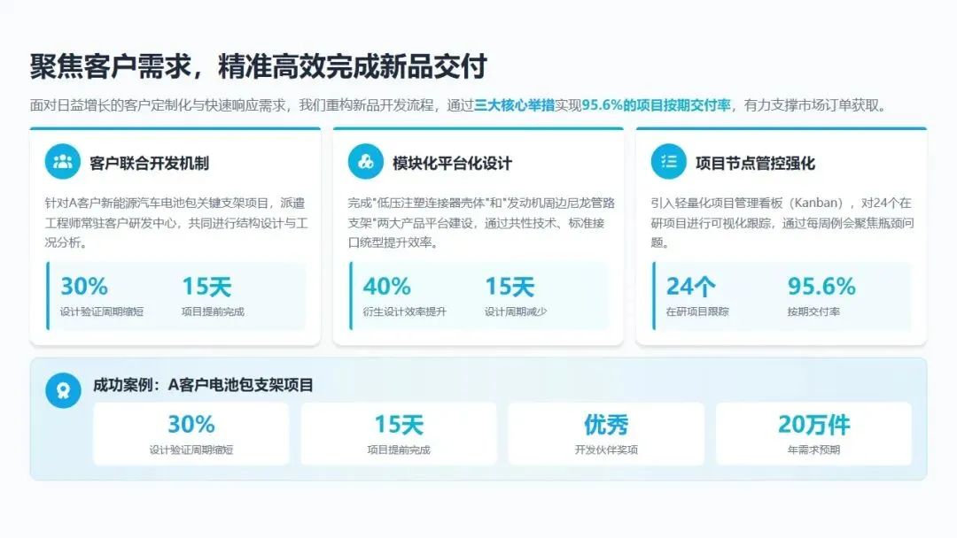 现在客户对定制化和响应速度的要求越来越高,针对性重构了新品开发流程,把以客户为中心落到每一个环节。- 针对A客户新能源汽车电池包关键支架项目,我们直接派工程师驻场办公,和客户研发团队并肩作战,一起做结构设计、分析工况。这种提前介入的模式,把设计验证周期压缩了30%,最终项目比计划早15天完成APQP全阶段,还拿到了客户颁发的“优秀开发伙伴”称号。