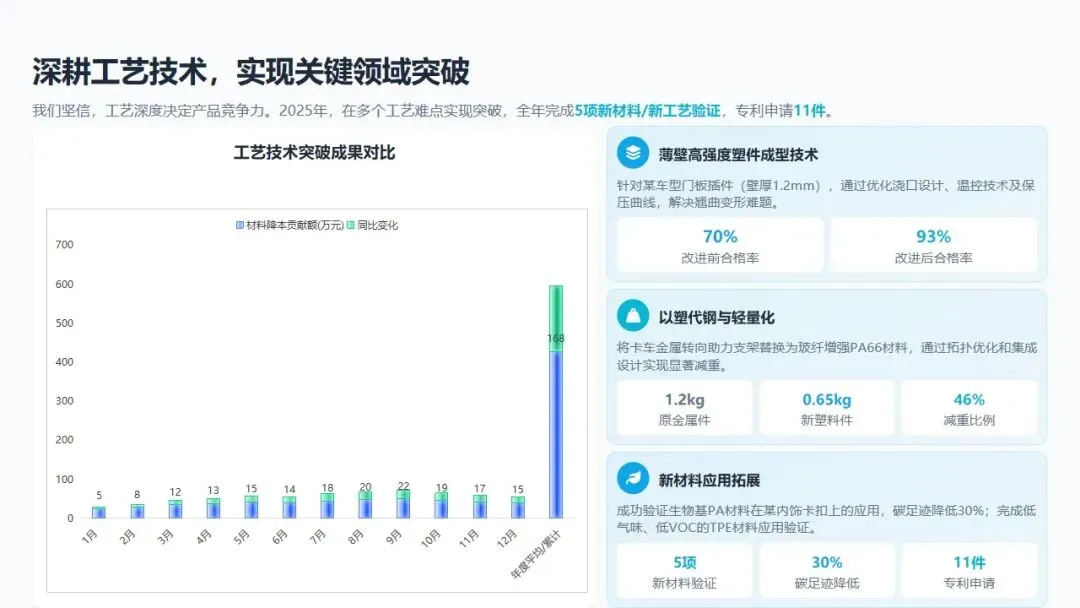 - 验证生物基PA材料在汽车内饰卡扣上的应用,碳足迹直接降低30%;还搞定了低气味、低VOC的TPE材料在密封条上的应用,帮主机厂顺利通过座舱空气质量测试。全年下来,共完成5项新材料、新工艺的验证落地。