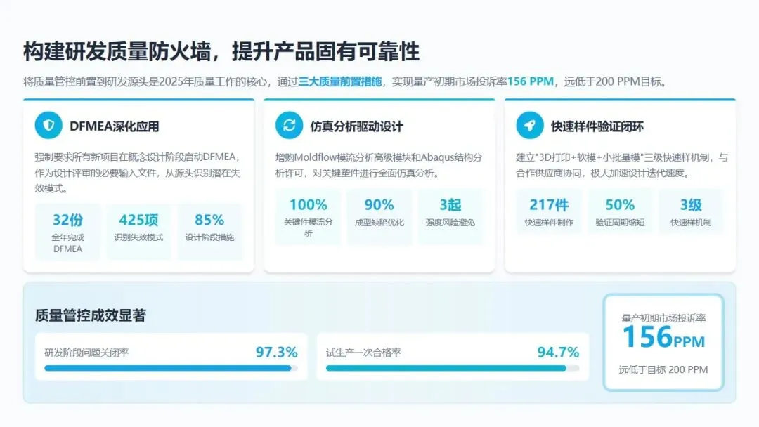 强化研发质量源头控制 | 量产初期市场投诉率≤120PPM | 156PPM | 降低23% |