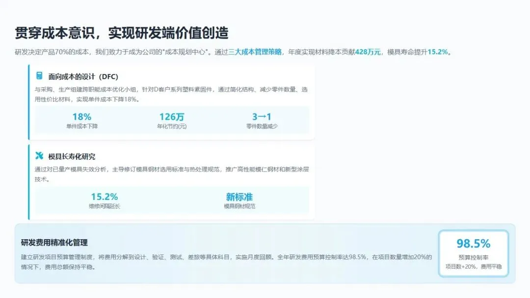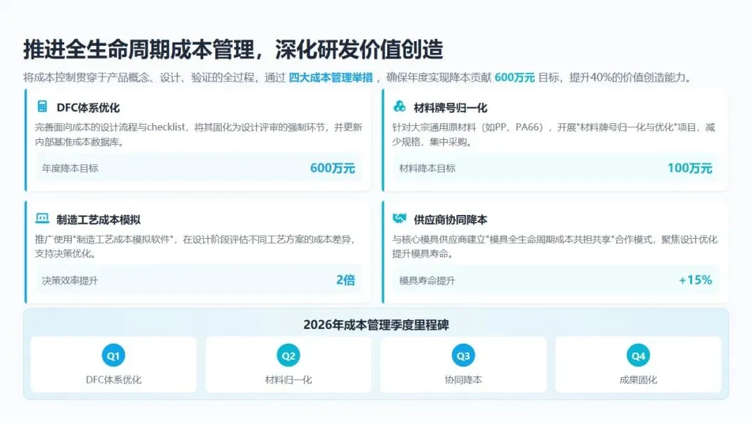 价值创造 | 深化面向成本与制造的设计 | 材料与工艺降本贡献额≥600万元 | 428万元 | 提升40% |