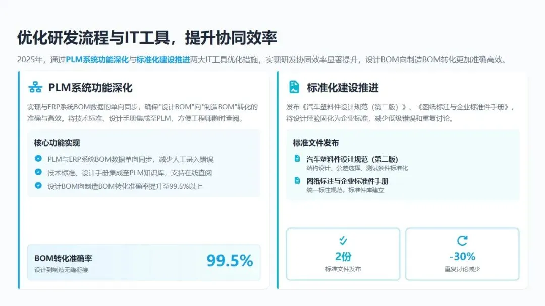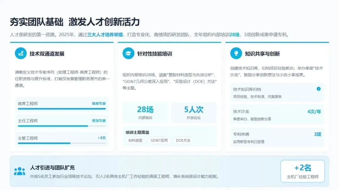 - 开展针对性技能培训:全年组织28场内部培训,内容涵盖塑胶材料选型、GD&T几何公差、实验设计(DOE)等实用主题;外派5名员工参加行业顶级技术论坛,还引进2名有主机厂经验的高级工程师,补齐了系统级设计能力的短板。