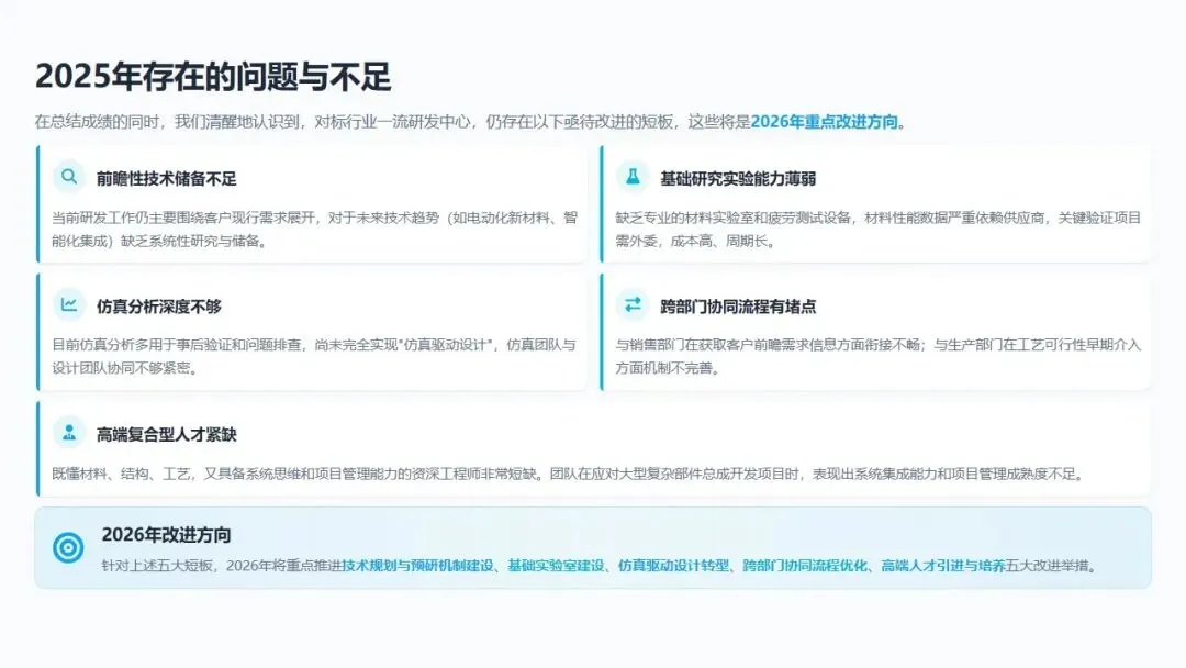 肯定成绩的同时,我们也清醒地认识到,和行业一流研发中心比,还有不少短板要补,这些问题都需要在2026年重点突破。- 前瞻性技术储备不够:目前研发还是以响应客户现有需求为主,对电动化带来的新材料需求、智能化对塑料件集成电子元件的需求等未来趋势,缺乏系统性研究。大多是被动接单,主动引导客户需求、提前布局技术的能力不足。