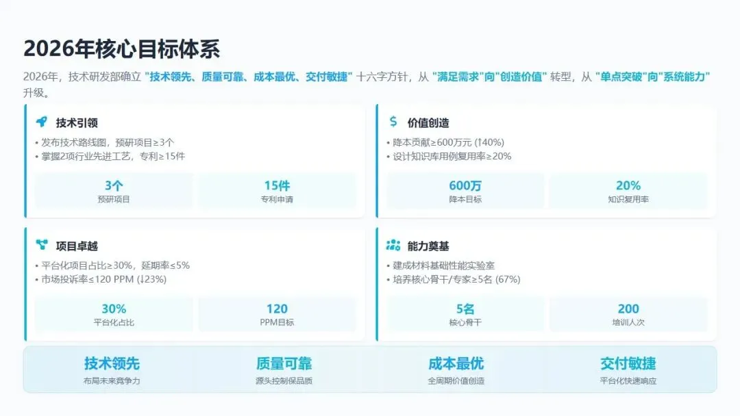 2026年,技术研发部将紧跟公司“深化创新、精益运营、全球视野”的战略部署,牢牢守住技术领先、质量可靠、成本最优、交付敏捷十六字方针。核心目标就是实现两个转型:从满足需求向创造价值转型,从单点突破向系统能力升级。通过强化技术规划、夯实研发流程、突破关键工艺、深化数字化应用,打造支撑公司未来五年发展的核心竞争力。一、指导思想与核心目标