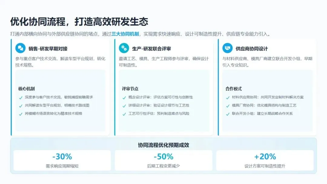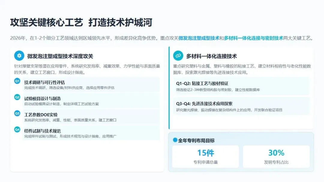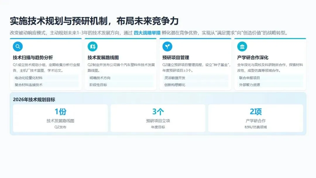 目标:改变被动响应客户需求的模式,主动规划未来1-3年技术方向,提前孵化竞争优势。- 第一季度完成技术扫描与趋势分析:成立专门的技术规划小组,定期收集行业报告、主机厂技术蓝图、学术论文和展会信息,重点聚焦电动化轻量化材料、高性能复合材料连接技术、免喷涂美学装饰工艺这几个方向,摸清行业前沿动态。
