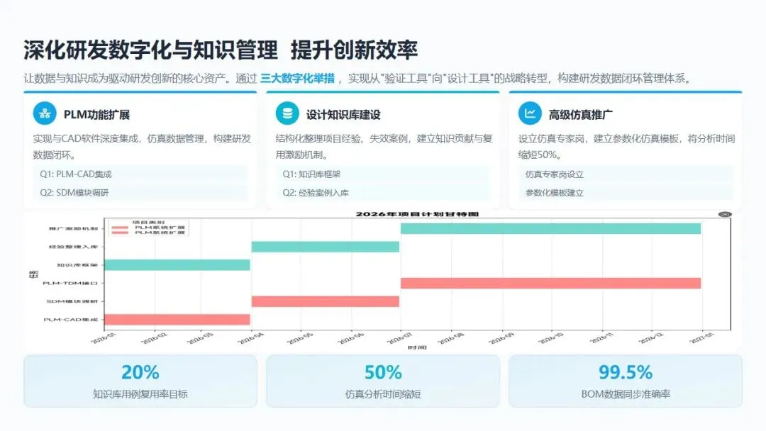 推动研发数据资产化与知识复用 | 设计知识库用例复用率≥20% | 分散,未统计 | 建立基线 |