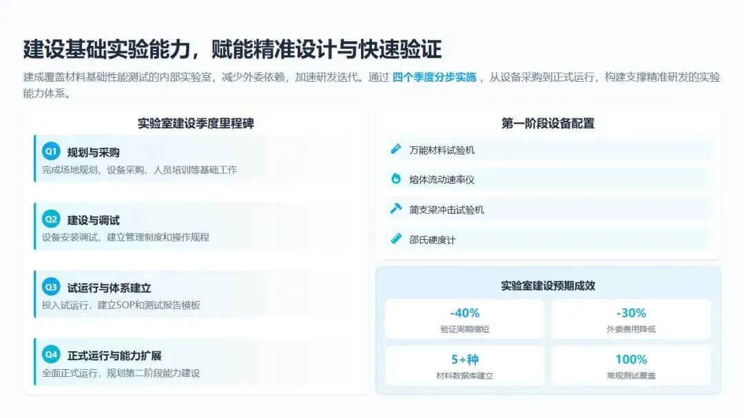 目标:建成覆盖材料基础性能测试的内部实验室,减少外委依赖,加快研发迭代速度。- 第一季度(规划与采购):完成实验室场地规划和电力、通风、安全等基础设施建设;确定首批采购设备清单,包括万能材料试验机(测拉伸、弯曲、压缩)、熔体流动速率仪、简支梁冲击试验机、邵氏硬度计;完成供应商调研、招标和技术协议签订;任命实验室负责人,安排人员参加设备操作培训,提前储备技术能力。