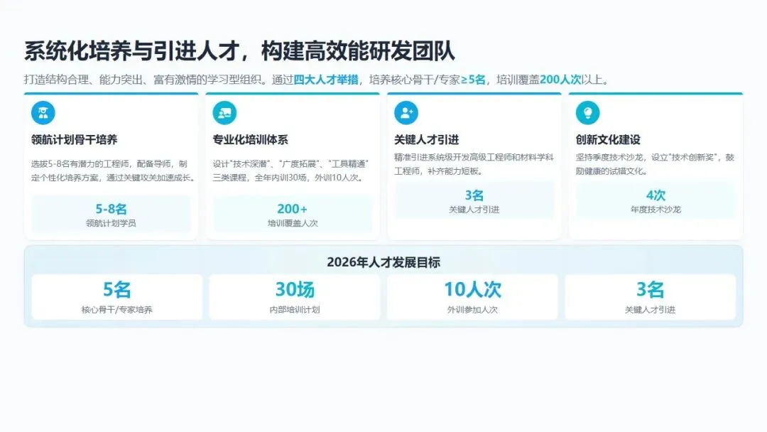- 资源保障:积极向公司争取支持,确保实验室建设、关键设备采购、高端人才引进、预研基金等核心研发预算足额、及时到位。优化内部人力配置,优先保障核心项目团队的人员稳定,让大家能集中精力攻坚。