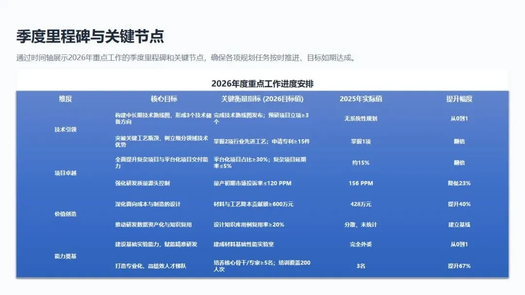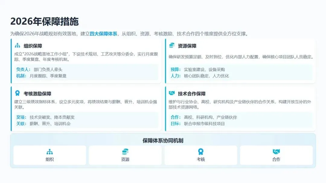 - 组织保障:成立部门负责人牵头的2026战略落地工作小组,下设技术规划、工艺攻关、能力建设等分委会,明确每项重点工作的负责人、支撑团队和资源接口。实行“每月跟踪进度、每季度复盘成效、全年考核兑现”的刚性管理,确保规划落地不打折扣。