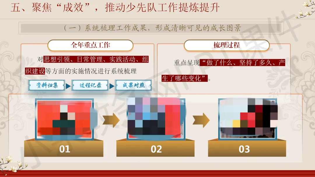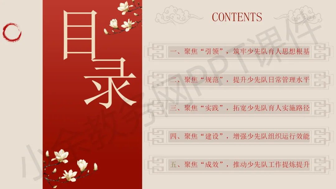这个课件内容组织合理清晰,以五个聚焦展开课件的内容,可以说关于学校少先队工作总结相关的要素都包含了,可以根据自身学校情况以此为模板进行更改,就是一份很好的少先队工作总结汇报稿件了。