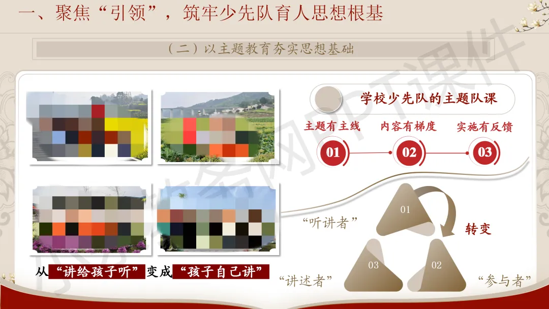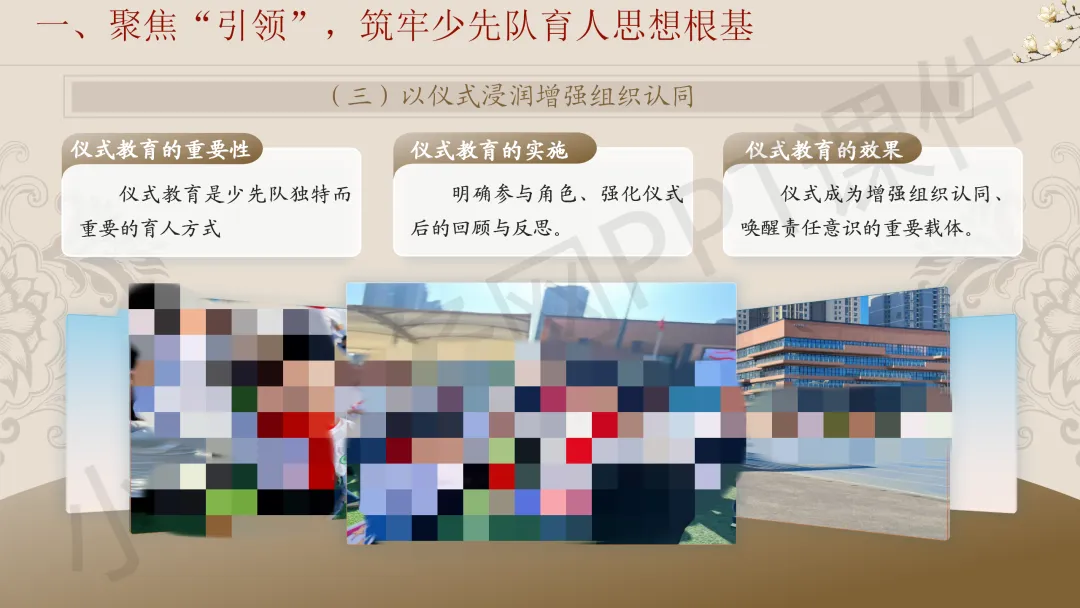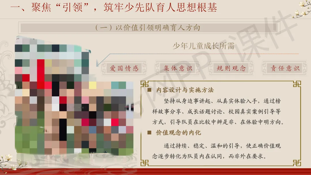 第一部分内容:《聚焦“引领”,筑牢少先队育人思想根基》教育之道,思想先行,价值先行,大方向不能偏,这部分大概讲的是少先队育人思想原则。