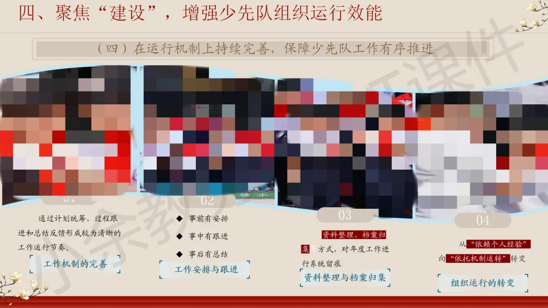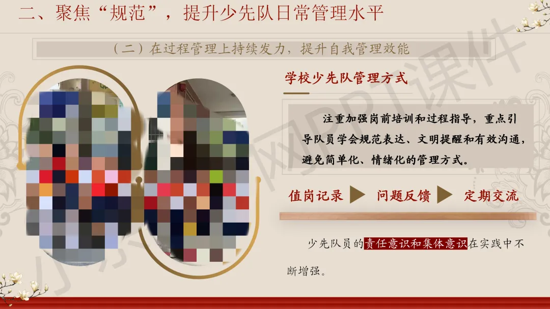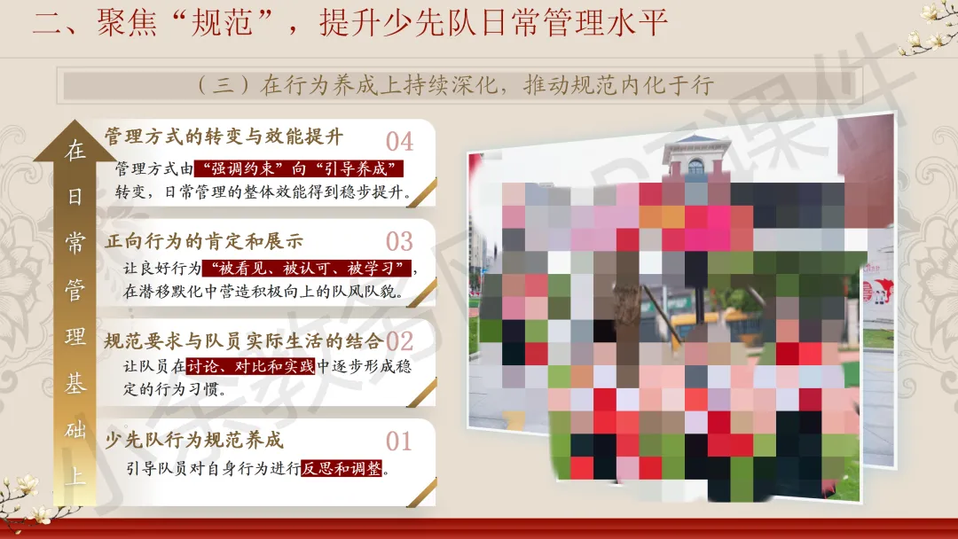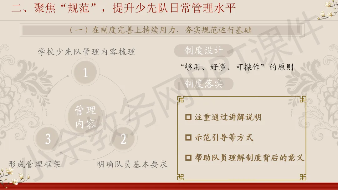 第二部分内容:《聚焦“规范”,提升少先队日常管理水平》少先队工作千头万绪,制定好基本规范,设计好流程非常重要,在整个大框架里大家各司其职,让少先队工作高效运转起来。