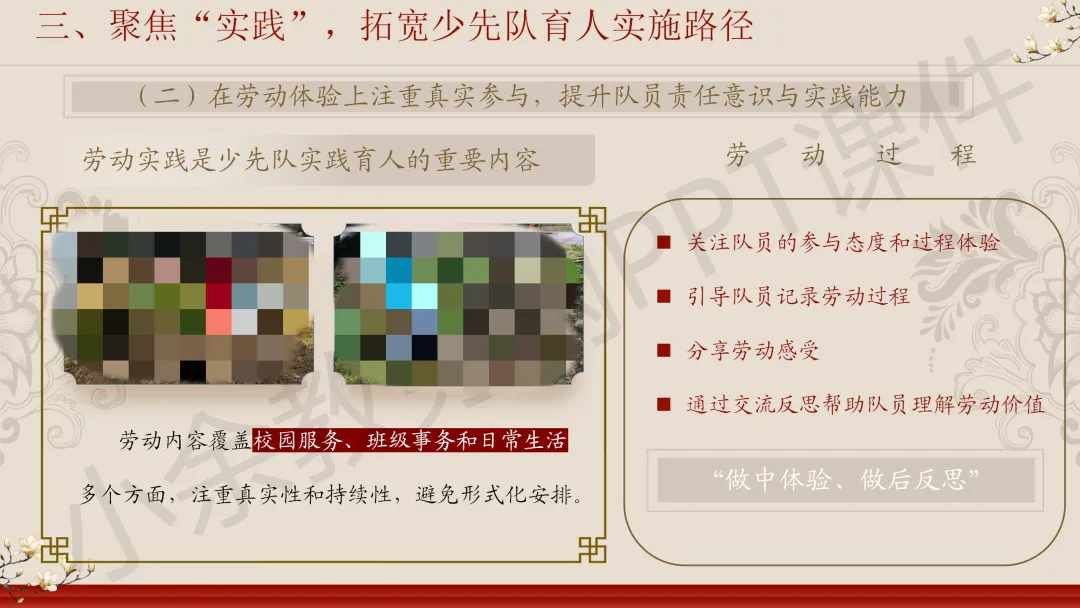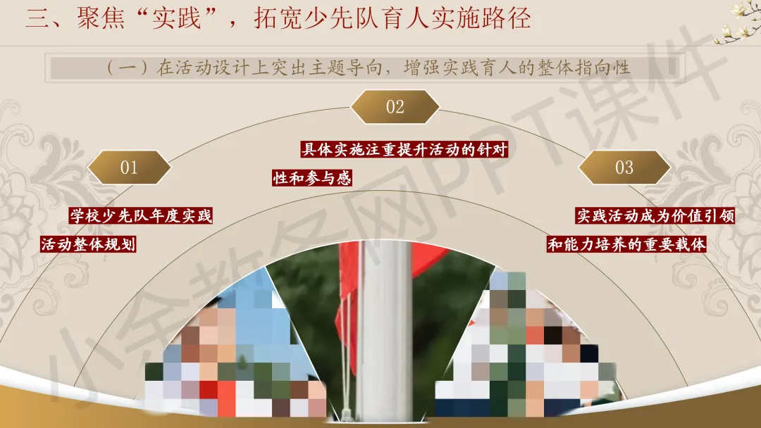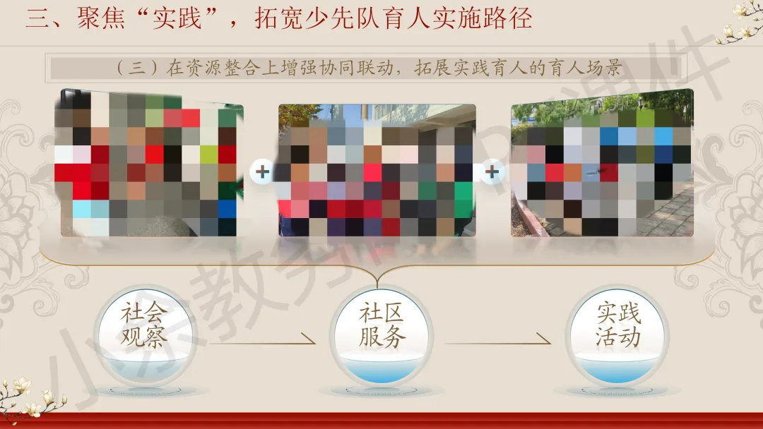 第三部分内容:《聚焦“实践”,拓宽少先队育人实施路径》光说不练假把式,少先队育人要结合一个个实践活动,毕竟实践才能出真知,只有亲身经历才会印象深刻呀。