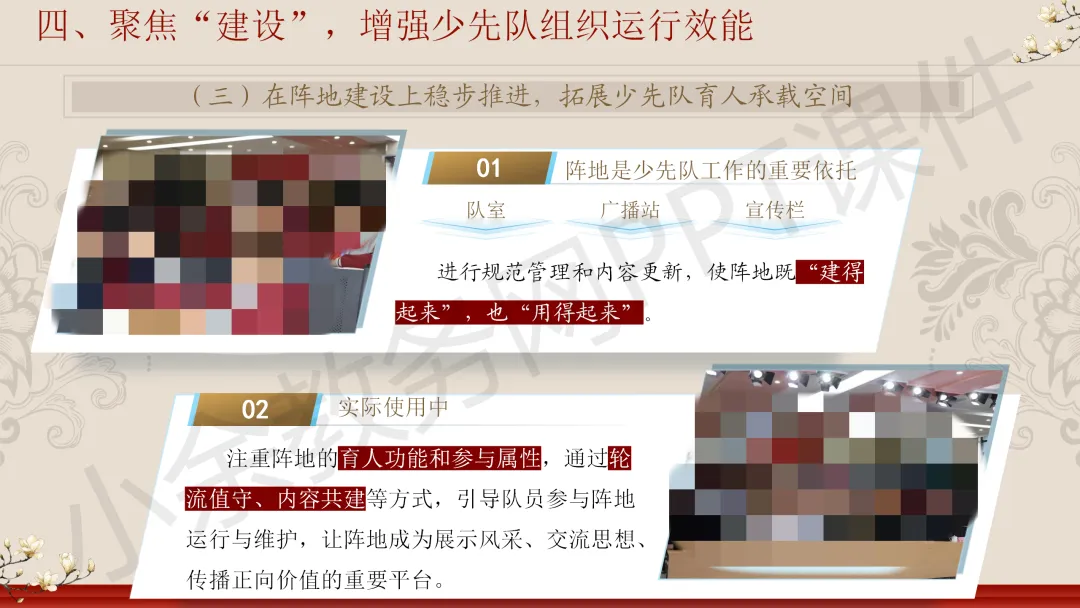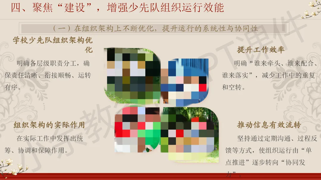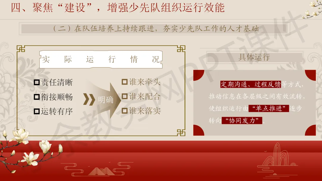 第四部分内容:《聚焦“建设”,增强少先队组织运行效能》少先队团队是整个少先队育人工作的大脑,它的好坏直接决定了工作质量的高低,这部分主要讲的是如何提升少先队组织的能力水平。