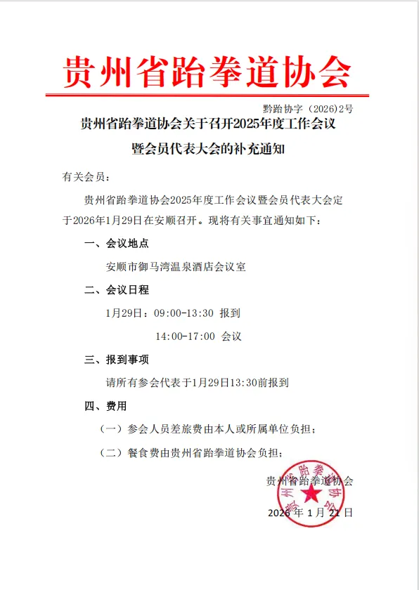 >贵州省跆拳道协会关于召开2025年度工作总结会暨会员代表大会的补充通知