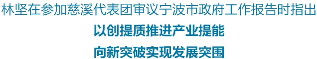 今天下午,宁波市委常委、慈溪市委书记、宁波前湾新区党工委书记林坚在参加宁波市十六届人大六次会议慈溪代表团审议时强调,要迭代实施“工业立市、实业兴市、创新强市”首位战略,以创提质推进产业提能,向新突破实现发展突围,为宁波建设具有全球竞争力、共同富裕先行的现代化滨海大都市作出更大贡献。
