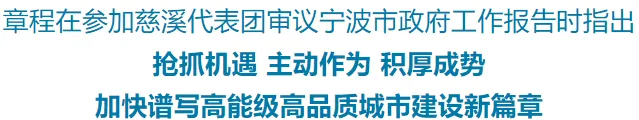 1月21日下午,慈溪市委副书记、市长章程在参加宁波市十六届人大六次会议慈溪代表团审议时强调,要明确目标定位,扛起责任担当,抢抓机遇、主动作为、积厚成势,加快谱写高能级高品质城市建设新篇章。