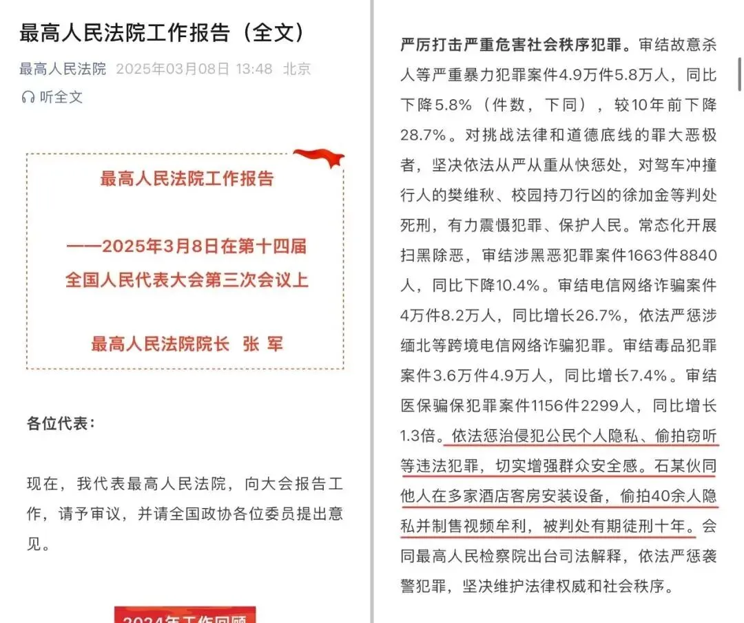 健全典型案例培育机制,全链条惩治宾馆房间盗摄案写入最高法院工作报告……