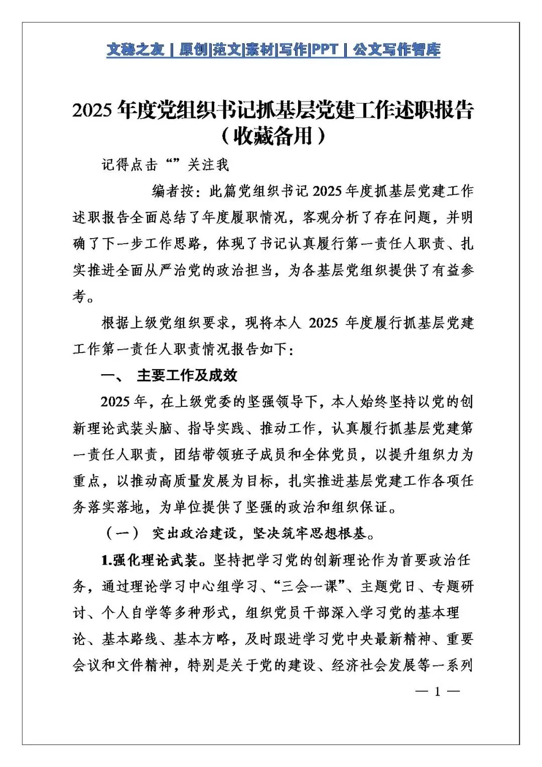 今天这篇《2025年度党组织书记抓基层党建工作述职报告(收藏备用)》写得扎实、规范,是典型的“模板级”范文。我仔细阅读过认为,全文结构清晰,逻辑严密,分“主要工作及成效”“存在问题与不足”“下一步工作思路与措施”三大部分,一步步往深里写,环环相扣,完全符合述职报告的文体要求。