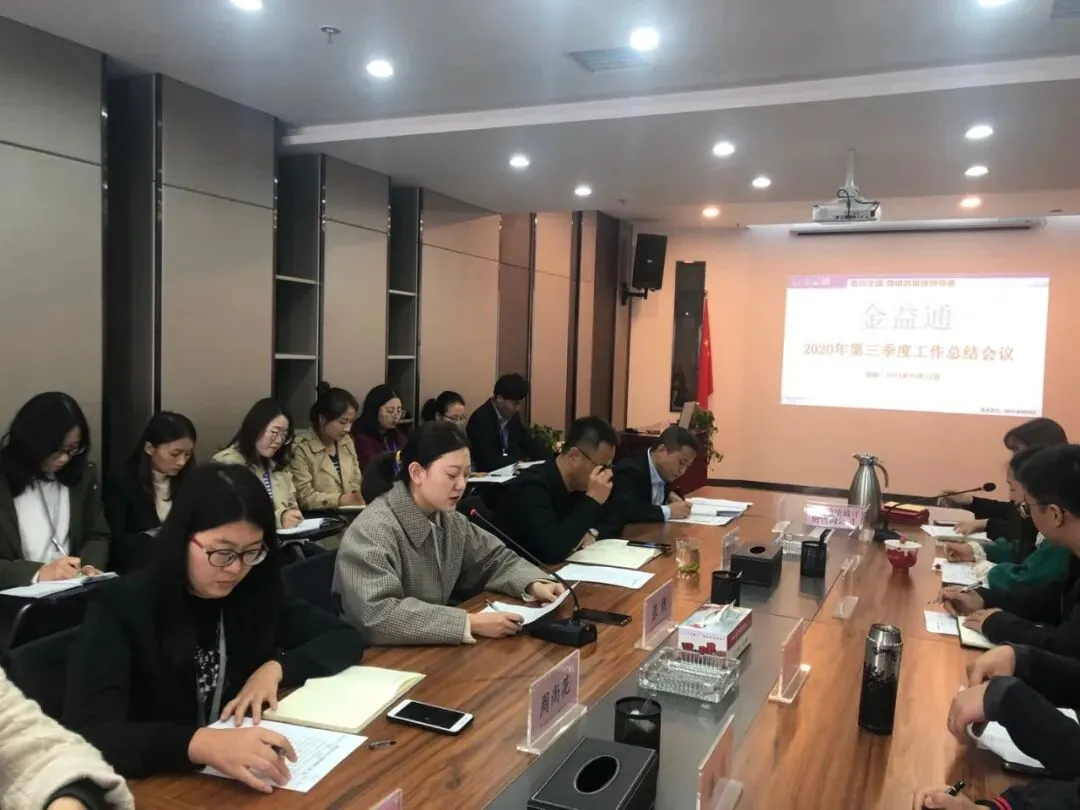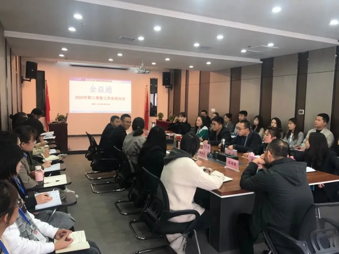 根据《金益通公司会议管理办法》,2020年10月12日下午公司在会议室召开金益通第三季度工作总结会议,会议主题是“各部门对2020年第三季度工作进行总结汇报及计划第四季度工作内容”。参会人员有金益通董事长、副总经理、绩效部总监、各部门部长、项目经理、项目助理、绩效专员、实习期员工等,共计43人。