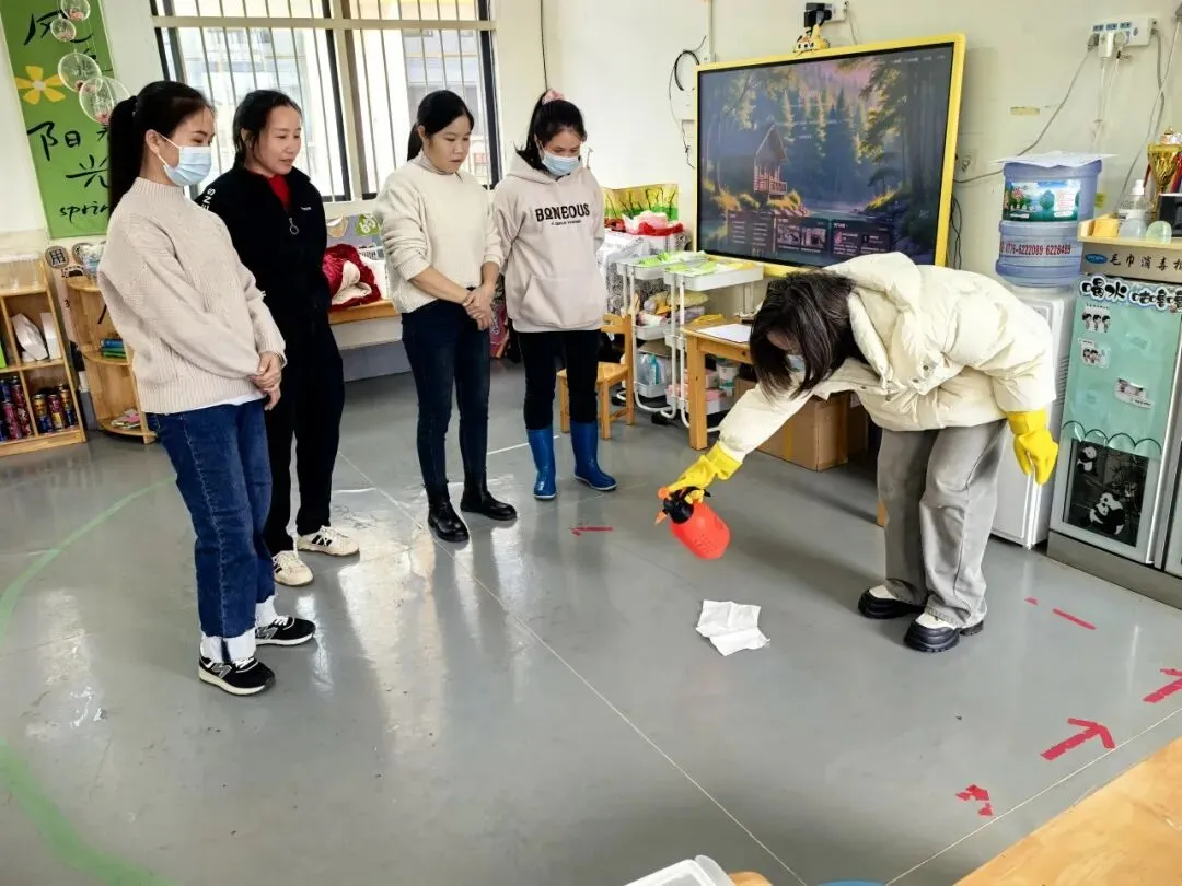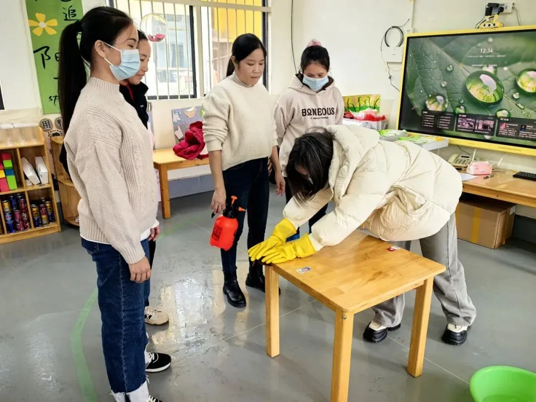 分管卫生保健的覃淑苹同志围绕消杀工作规范化目标,完成桌椅消毒、呕吐物处置等实操培训,同时开展入班现场指导工作。