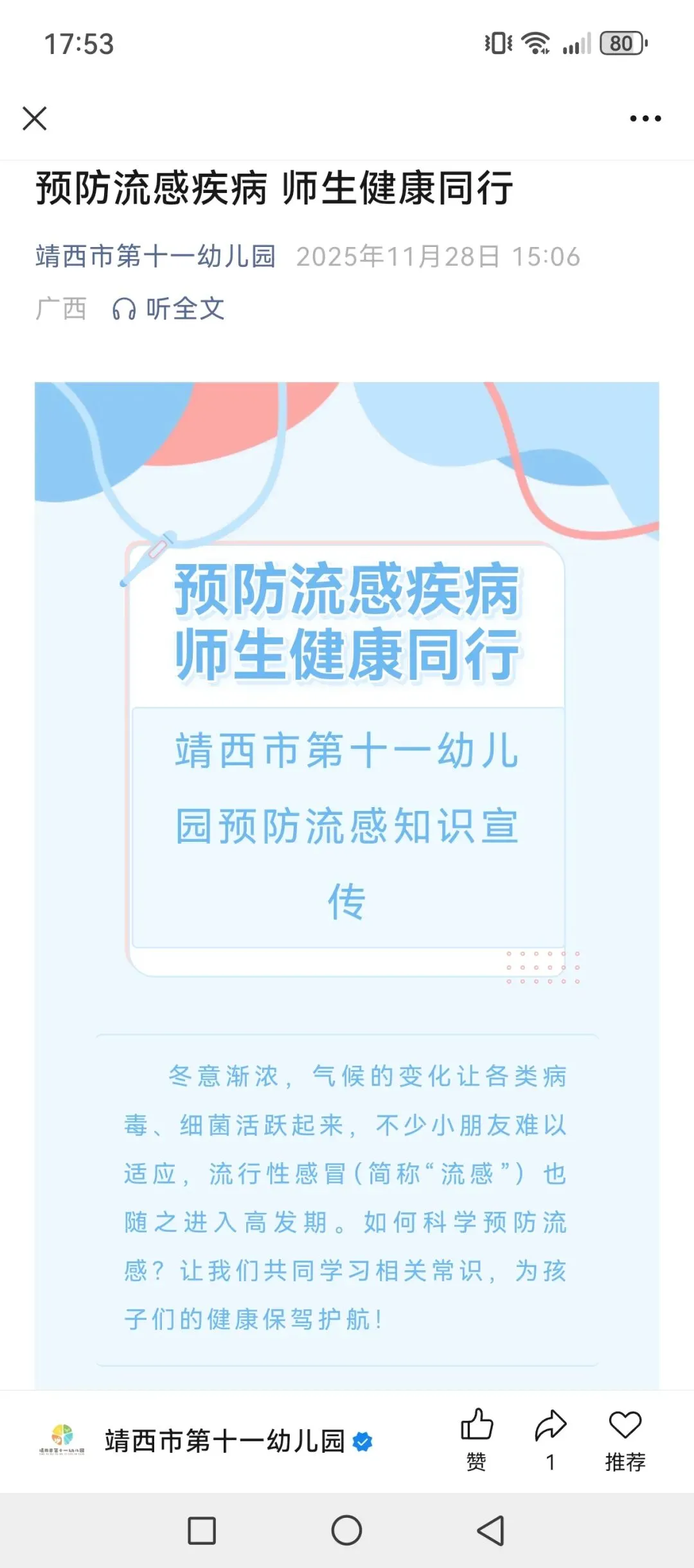 围绕流感防控工作,我们通过班级主题活动、家长群转发告知书及防控知识报道的方式推进落实。