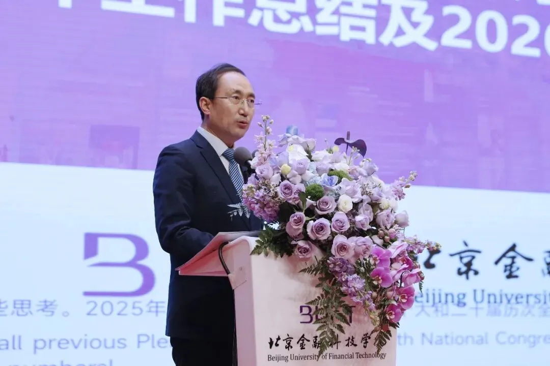 校长吕宪栋作《北京金融科技学院2025年工作总结及2026年工作部署》的工作报告。报告指出,2025年学校以“数智、共创、向上”为年度主题,在立德树人、无边界育人模式探索、国际交流、内涵建设等方面取得扎实进展,毕业生就业质量与升学率连续7年蝉联武书连民办高校榜首,产教融合与数智赋能呈现新亮点,“国际·北金科”等品牌形象深入人心。校长吕宪栋系统回顾了2025年学校取得的丰硕成果:在育人成效方面,学校连续七年蝉联武书连排行榜“本科毕业生就业质量”和“升学率”双项第一,人才培养的“金字招牌”更加闪亮;在数智赋能方面,“1+2+3”人工智能赋能课程体系方案落地实施,AI空间站、智慧思政平台等数字化教学场景建成启用,首届大学生AI短视频创意嘉年华成功举办,数字化变革已深度融入教育教学全过程;在无边界育人方面,通过成立宠业学院、举办合作伙伴盛典、改造复合型育人空间、实施“家校联盟”等系列举措,在校地、空间、部门、家校等多个维度打破了传统边界,育人生态持续优化;在品牌建设方面,“国际·北金科”、“公益·北金科”、“书香·北金科”三大品牌形象深入人心,国际教育大厦稳步推进,公益移动图书站遍布社区,书香校园建设成果显著;在校园环境方面,“北金科十二景+”美丽校园建设让学生拥有了绿动公园、创意舱体、萌宠家园等治愈型成长空间,实现了“景景育人”。