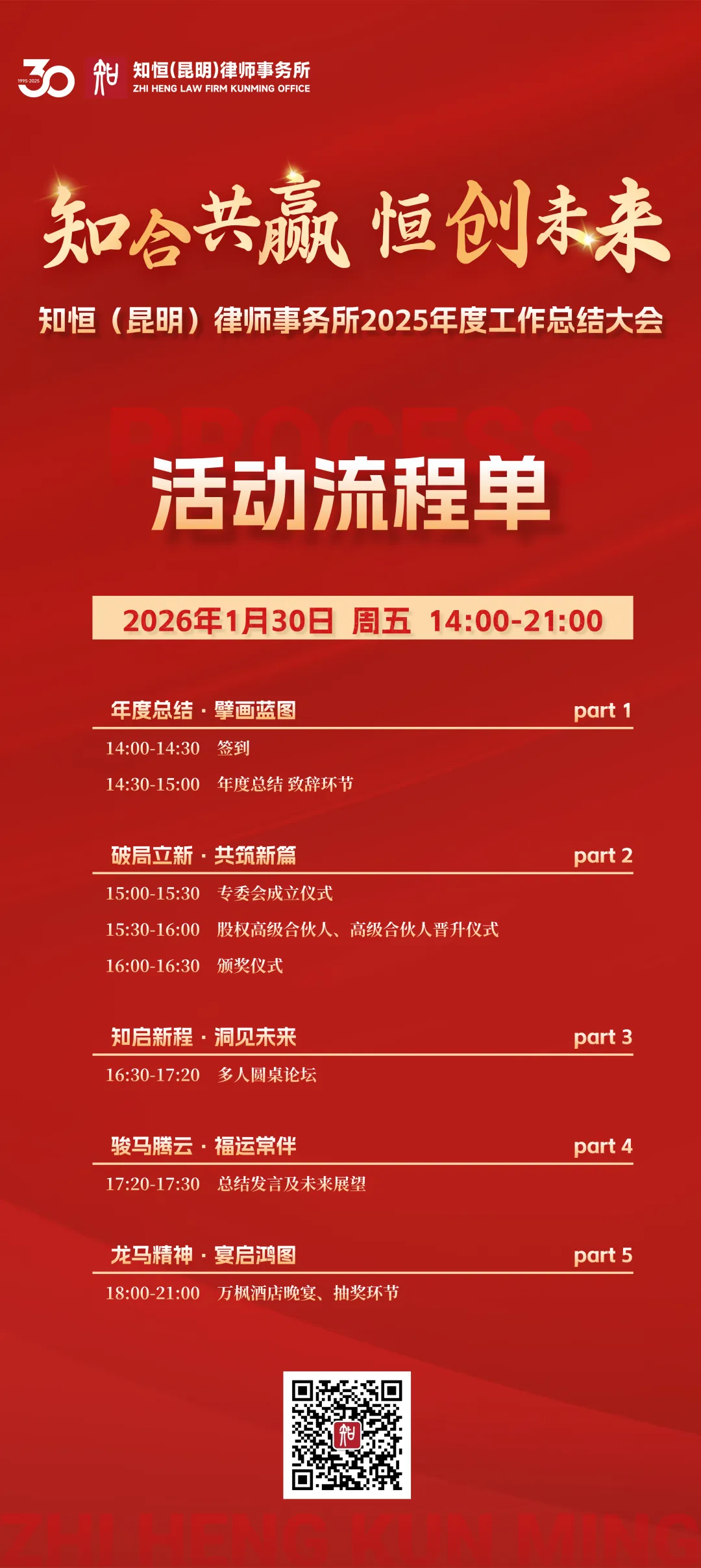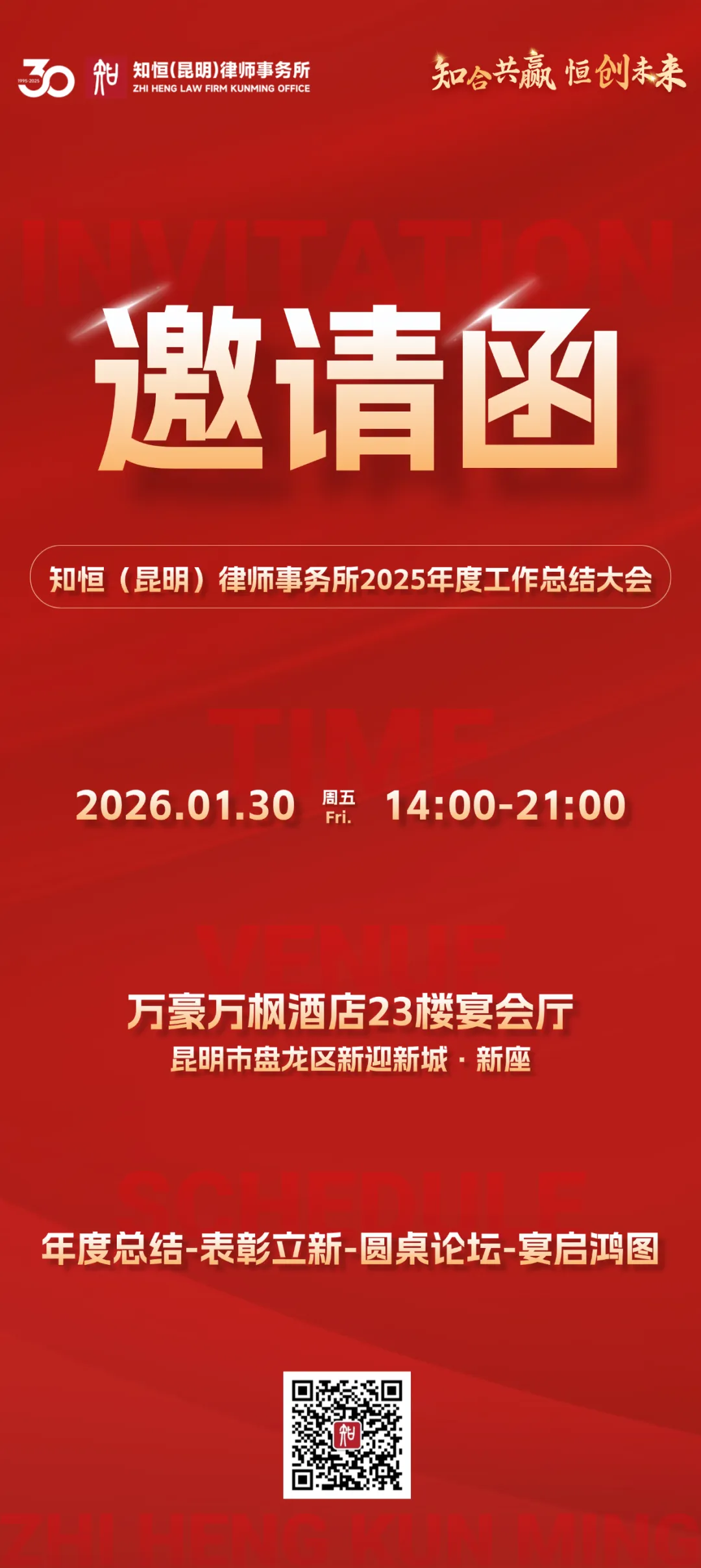 为全面总结过往经验、表彰先进典范、擎画未来蓝图,2026年1月30日下午,我们诚挚邀请您共赴 “知合共赢·恒创未来”知恒(昆明)律师事务所2025年度工作总结大会,与全体知恒人一同回望耕耘路,聚力启新程!