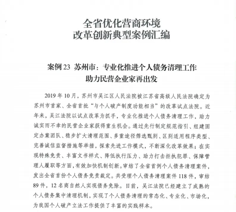 2025年,省优化营商环境领导小组办公室印发《全省优化营商环境改革创新典型案例汇编》,发布35则典型案例,吴江法院“专业化推进个人债务清理工作 助力民营企业家再出发”案例入选,为苏州市入选的两个典型案例之一。