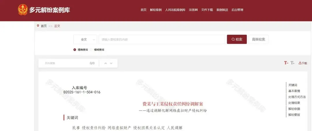 2025年,吴江法院编撰的案例《费某与王某侵权责任纠纷调解案——通过调解化解网络虚拟财产侵权纠纷》入选最高人民法院多元解纷案例库,成为全国范围内首批入选该案例库的246件案例之一。