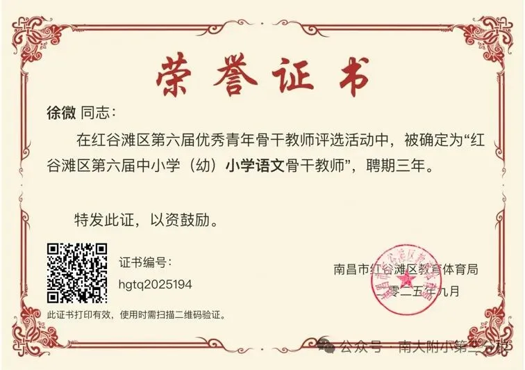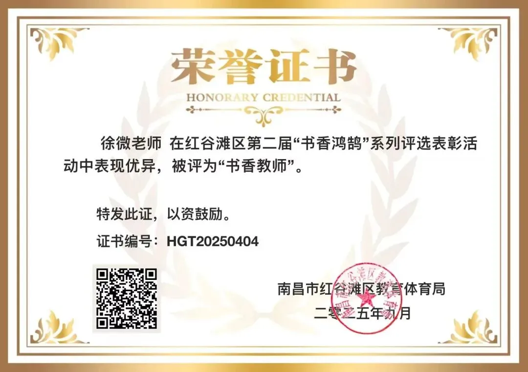 徐微老师获评红谷滩区2025年“书香教师”;