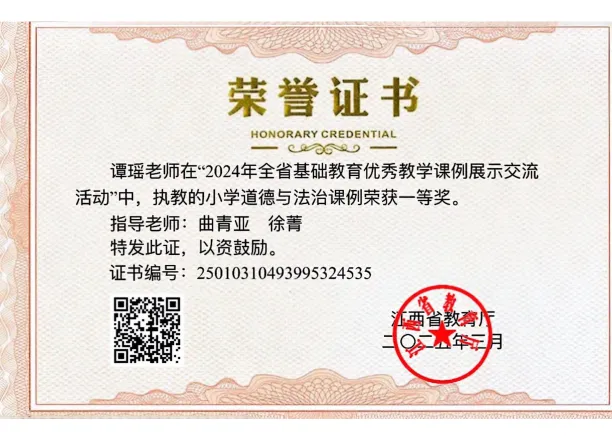 谭瑶老师代表南昌市参加江西省基础教育优秀教学课例展示活动(“赣教杯”竞赛)中获一等奖;